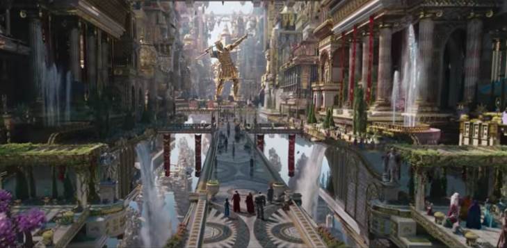 Another shot of Olympus shows us a giant statue of Zeus at the center of this beautiful city. Meanwhile, we can also spot a few familiar characters walking across a bridge into the city. We can clearly see Valkyrie and Korg but there also appears to be two Thors. We’ll get an explanation for that later.