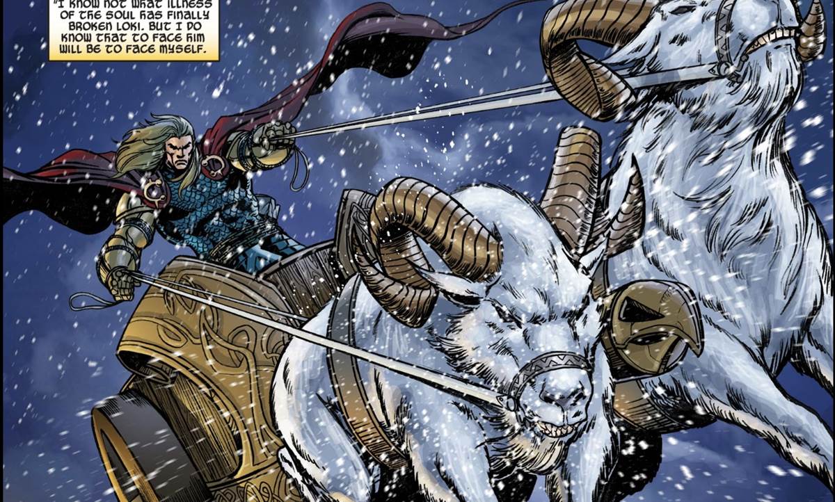 We then see what looks like New Asgard as a ship of some sort is pulled by two giant magical goats over the water. These goats have been in the service of Thor for a long time in the comics and go by the names Toothgrinder and Toothgnasher.