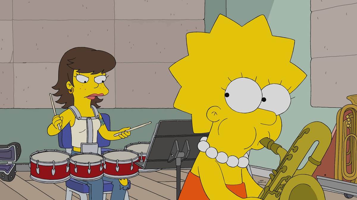 “Girls Just Shauna Have Fun” begins with the Springfield Elementary School band practicing “Mary Had a Little Lamb” with Mr. Largo, who is frustrated by the band’s lack of polish. Principal Skinner enters with a letter from the local high school, which has requested Lisa Simpson to replace an injured saxophone player. The next day, Marge drops Lisa off at the high school and the eight-year-old girl takes a seat with the teenagers. The band leader there has the students play the “Theme from Hawaii Five-O” until interrupted by Superintendent Chalmers’ daughter Shauna (recurring guest star Tress MacNeille), who enters the class late. “I’m going to call you James Corden, because you’re a late late show,” jokes the teacher, and the students appreciate the reference. Lisa reintroduces herself to Shauna, but has to remind her that she babysat for the Simpson children the previous Saturday night.