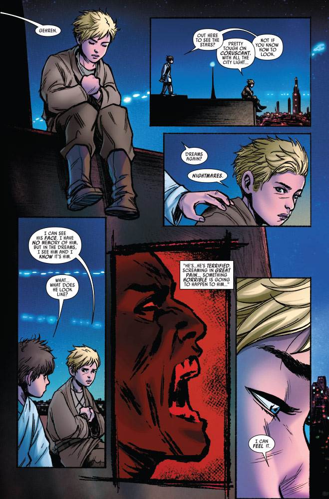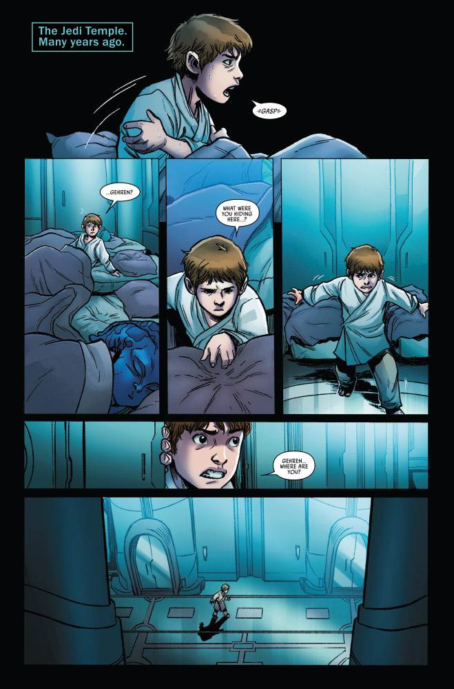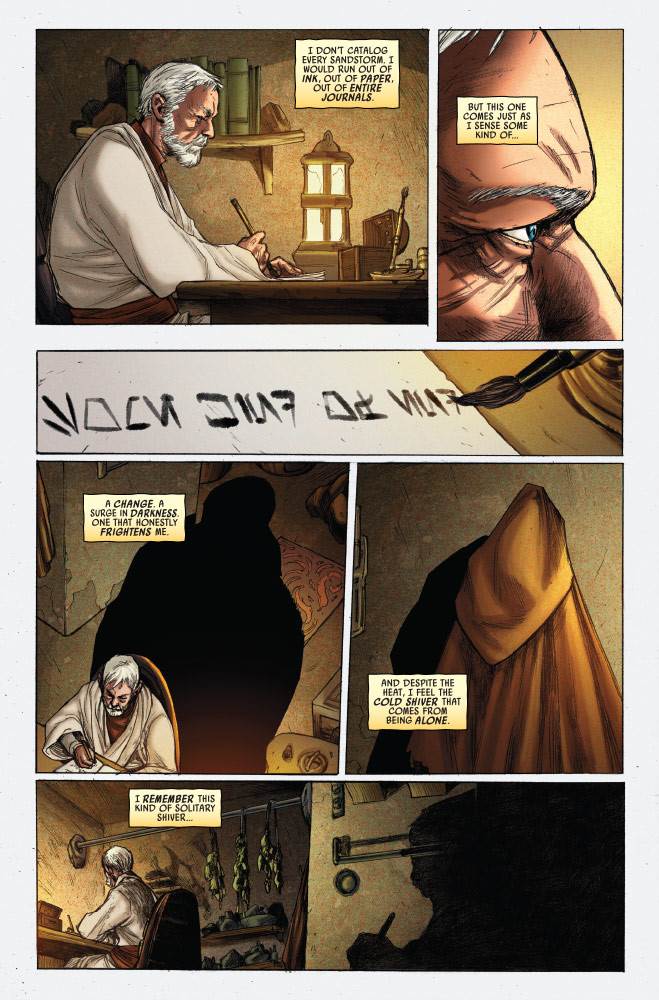 Obviously this comic miniseries is intended to tie-in (at least in a synergistic marketing sense) with the upcoming Star Wars: Obi-Wan Kenobi live-action limited series arriving on Disney+ at the end of this month, and that’s where the strategy of featuring McGregor’s– and Vader’s– likeness comes into play. But once you get past that slight bit of misdirection, Obi-Wan #1 is a fairly entertaining setup for what is likely to show up in the subsequent issues. Here we start with “Old Ben” alone in the desert, during the period just before the events of the original Star Wars film (AKA Episode IV - A New Hope), as he patiently waits for a sandstorm to arrive at Tatooine’s desolate Jundland Wastes where he’s made his reclusive home. Obi-Wan battens down the hatches on his hut and sits down to write down memories in his journal (first seen in the pages of Marvel’s excellent 2015 run of Star Wars comics) about the last time he felt this lonely. In an extended flashback, we see young Obi-Wan (somewhere around age 10) searching the Jedi Temple on Coruscant for his missing fellow youngling Initiate.