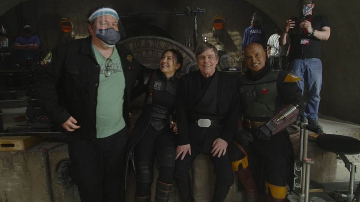 - We see Favreau, Wen, and Morrison posing for a photo with Mark Hamill (dressed in Luke’s black Jedi outfit) on Boba Fett’s throne room dais.