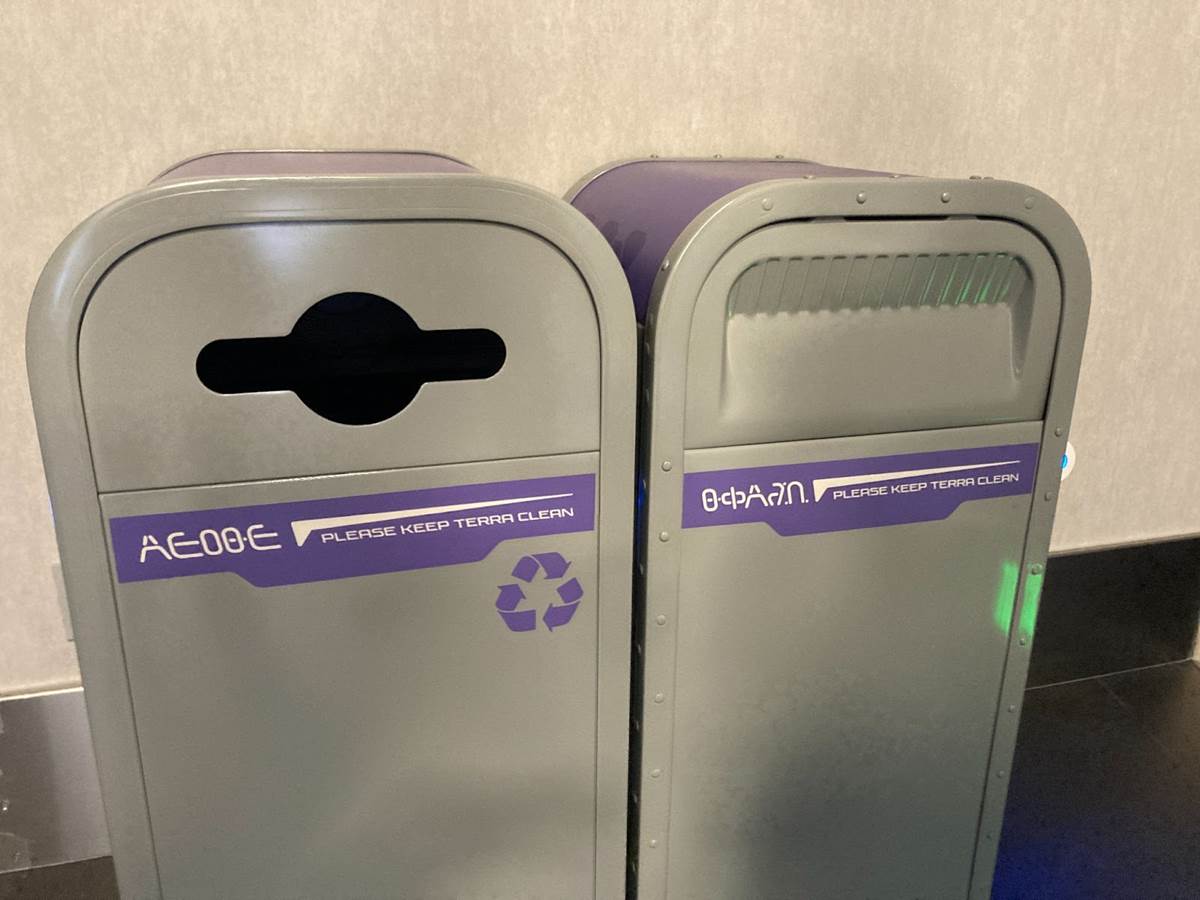 The trashcans throughout the queue simply translate to “REUSE” for the recycling and “SCRAP” for the trash.