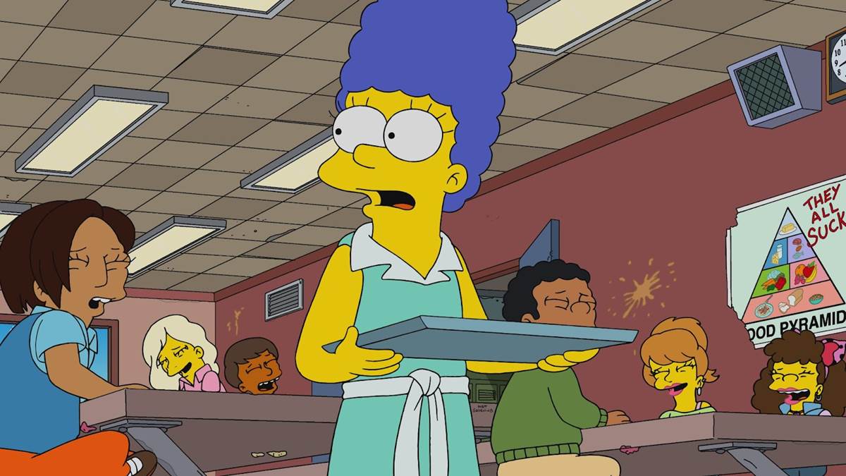 Homer raises a toast to “Lisa ‘what’s-her-middle-name’ Simpson,” but Moe and the barflies admit they were never convinced Lisa was Homer’s child. Homer vows to prove them wrong: “You losers will never have this!” he says, flashing a “World’s Greatest Dad” keychain, but then realizing that he left Maggie in the car. At the supermarket, Marge runs into Helen Lovejoy, who insults her food choices, and Bart insists on playing another prank. When Helen uses the restroom, Marge and Bart sneak low-quality food items and “Gassy Granny” underwear into her shopping cart, causing her to be embarrassed at the checkout cashier. Marge and Bart toast to their prank’s success with fruit cups, while at home, Homer attempts to find common ground between Lisa and himself. He tries a vegetarian sandwich and likes it, so he joins Lisa at a vegan restaurant, but that night he admits to Marge that he hated the meal.