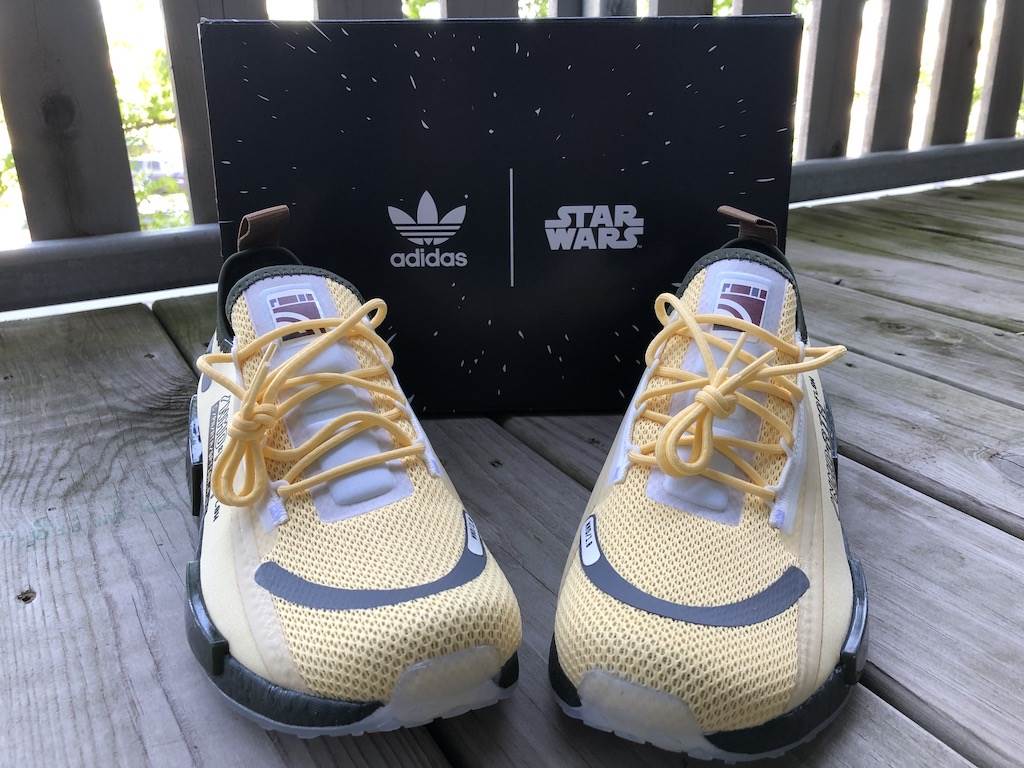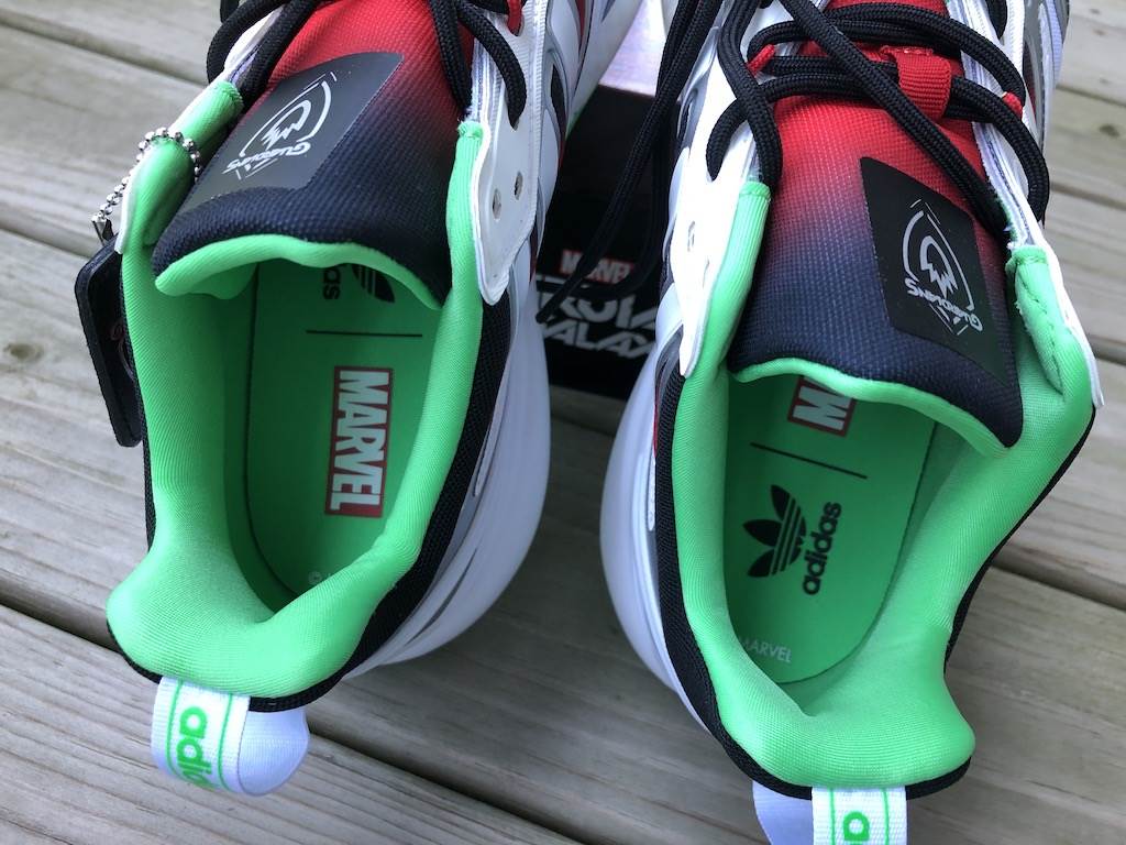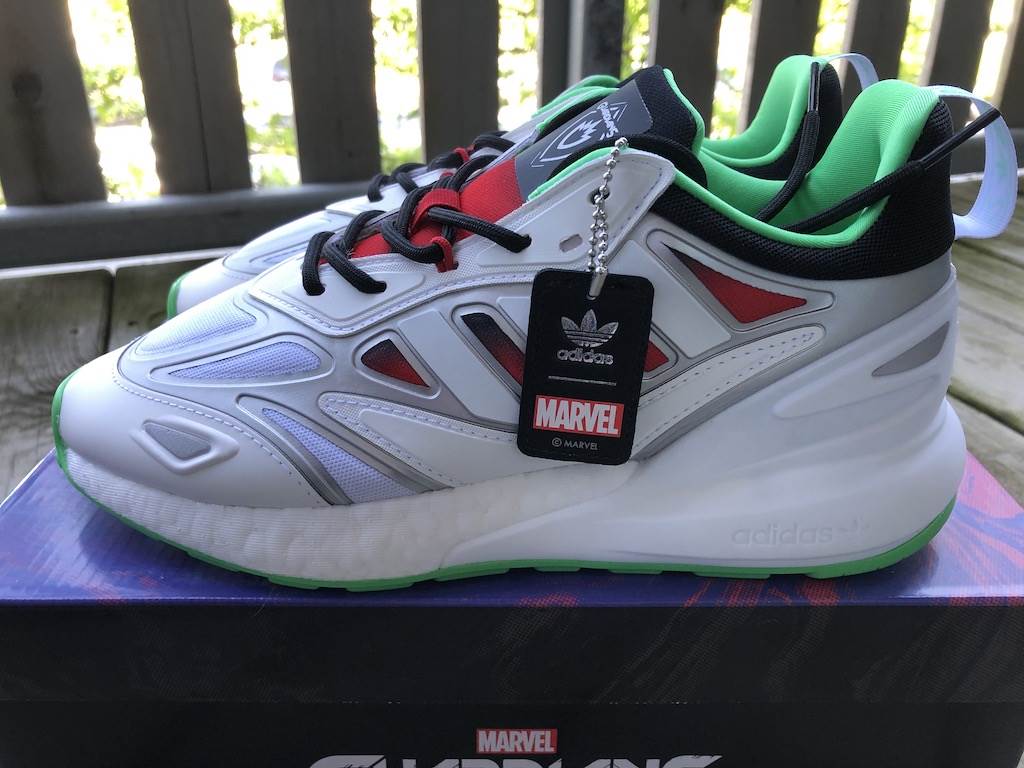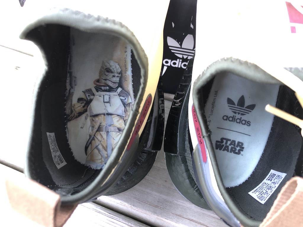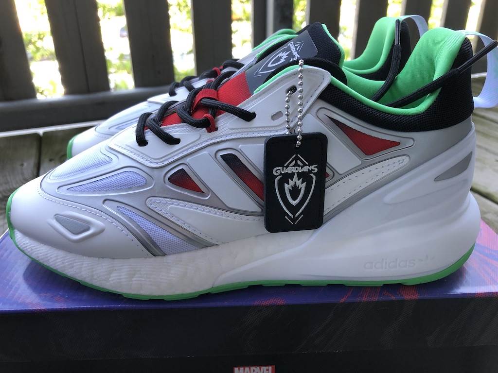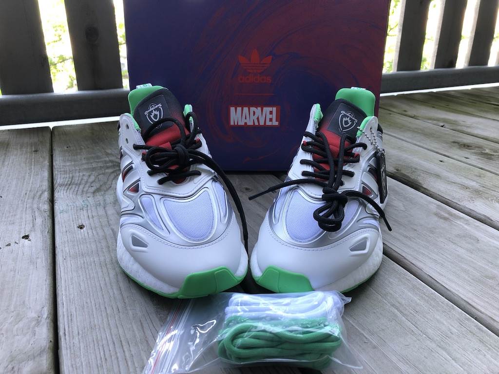 In anticipation of our sneaker post, Adidas sent us two pairs of shoes to check out and we couldn’t believe our luck that we got designs from their Marvel and Star Wars lines! As long time fans of the brand—our go-to running shoes—we were super excited to open the new Guardians of Galaxy Gamora ZX 2K Boost Shoes and Star Wars Bossk NMD_R1 Spectoo Shoes.