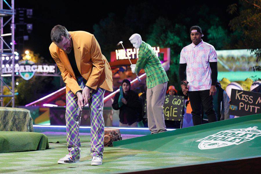 We now head over to PoleCano where Gari and Bob take on the hole. Rob feels that this hole is surrounded by some kind of The Brady Bunch style curse. A reference that’s sure to go over like gangbusters on a show that gets its contestants mostly from TikTok and Instagram. Gari actually launches his ball into the proper channel that will take it to the Tiki position, a prime location for putting once on the green. However, Bob somehow triggers the curse when his ball goes missing in the plinko portion of the hole. Don’t worry though, Course Marshall Joe is on the case. Which means they’re just going to stare at the board until the ball reappears, which it did. Though Bob sticks the landing when he gets blasted into the pole saving himself a stroke penalty, Gari thanks to his advantageous lie takes the win.