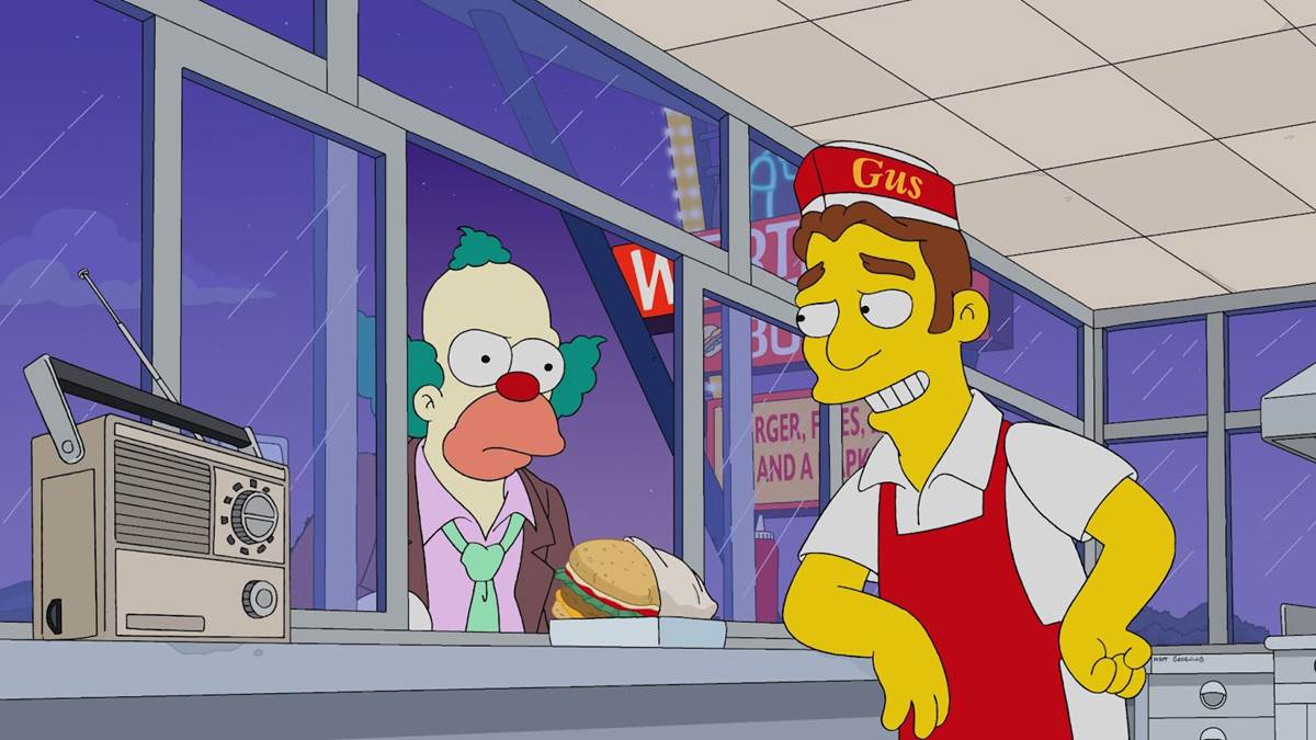 Augustus Redfield, an elderly Gus from earlier, shows up claiming to be the ninth richest person in the world and threatens to destroy Krusty. He has purchased Krusty’s parent corporation and strips him of everything, including his stage name. Gus changes the burger price to 24 cents to win over the crowd that begins booing him. “I finally have the one thing every businessman wants: total revenge on the clown who stole his dreams." Grampa says he used to be Gus’s partner, and the two friends are reunited, with Gus telling Abe his life is about to change. Another flashback to 50 years earlier shows Krusty working as the mascot for Gus and Abe’s restaurant, but he demands more pay– “I finally found my true purpose as an artist: selling cheap meat to fat kids." They fire him and he goes off to found Krusty Burger, which is immediately popular, and Gus vows to take revenge.