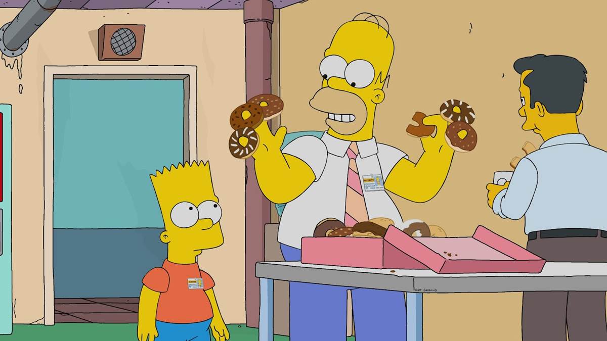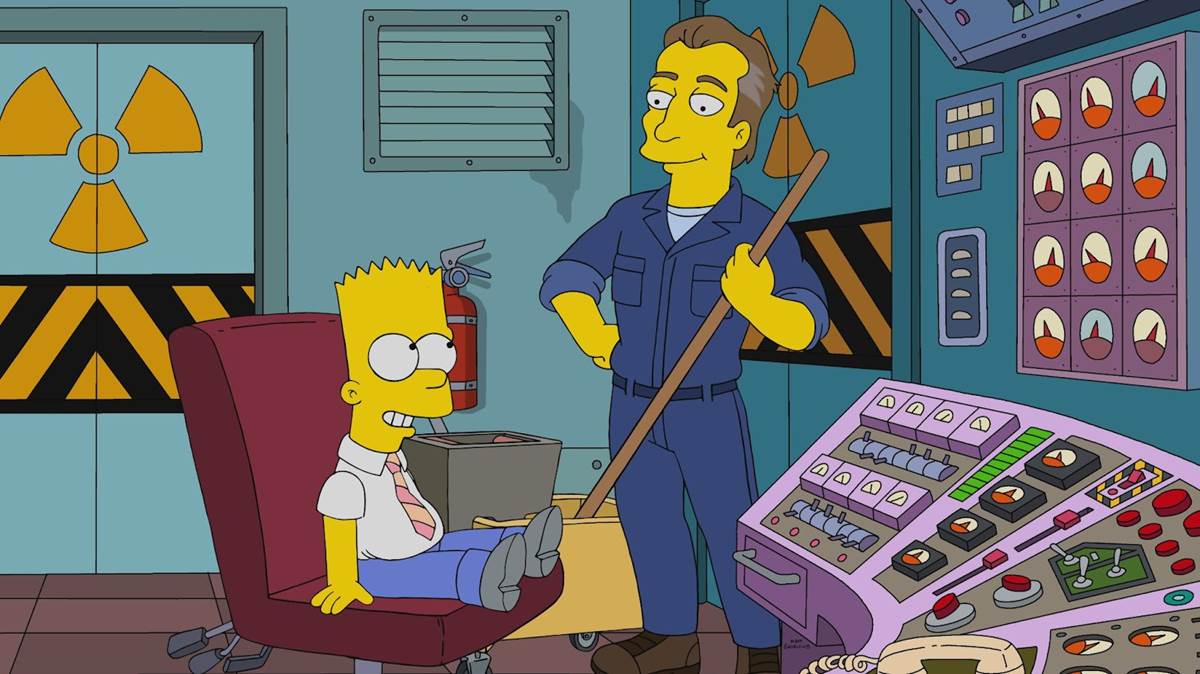 But being left alone with her friends means Marge and the ladies start drinking to enhance their enjoyment of the show, and by the next (Sunday) morning the Simpson patriarch is feeling a bit too hungover to go to church. So Homer takes the kids to the service and when Lisa and Bart are pulled into Sunday school, he urges Maggie to cry as an excuse to sneak out into the hallway. There, he overhears Bart giving an iPad presentation themed to the commandment “honor thy mother and thy father" that isn’t entirely flattering to Homer, to say the least. This spurs Homer to take Bart to work with him the next day, demonstrating that he basically gets paid to “not blow up the town." Bart consequently comes to idolize Homer and even begins to dress like him, saying that he now wants to grow up to become a nuclear safety technician like his father. But Lisa teases Bart with some bad news about his new dream, and then the boy gets the truth spelled out for him in the suddenly musical final act of the episode thanks to a surprisingly informative janitor (guest voice star Hugh Jackman) and a toe-tapping tribute to the death of the American middle class.