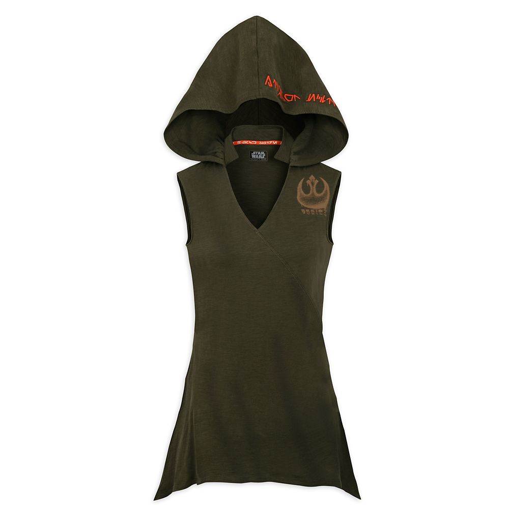 “Rebel against the typical fashion trends in this sleeveless hooded tunic with Rebel Alliance Starbird graphics, embroidered Star Wars indicia, and a stylish, sleek souvenir of Black Spire Outpost at Star Wars: Galaxy's Edge."