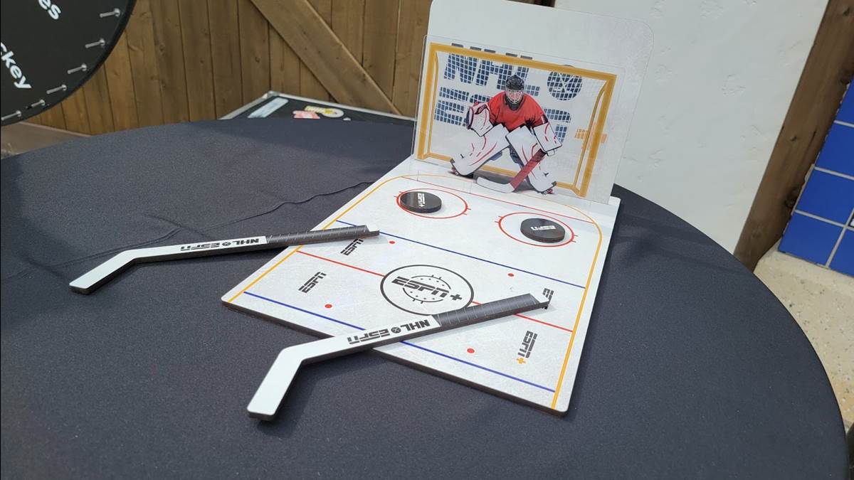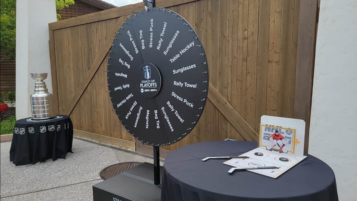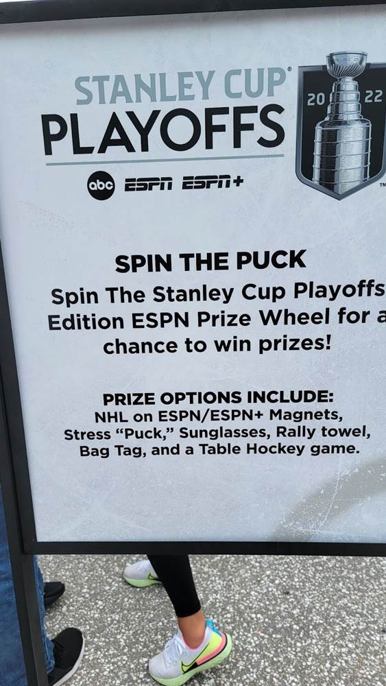 In addition to having a photo taken with the cup itself, guests can also spin a prize wheel to score some hockey and ESPN+ swag. Some of the prizes included an ESPN+ bag, sunglasses, magnets, a table hockey display, and more.