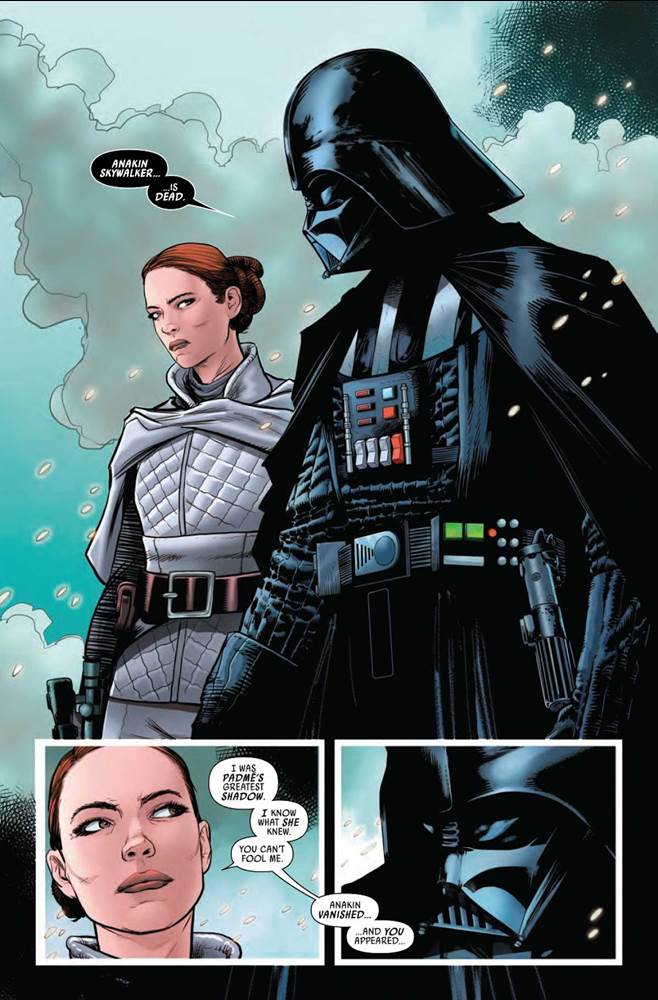 At the beginning of Darth Vader, volume 3, issue #23, released today, Sabé (once Padmé Amidala’s most trusted handmaiden, confidant, and body double) tells the Dark Lord that she’s figured out his true identity. Vader denies it at first, but when the woman from Naboo shows her work, he stops putting up much of a fight.