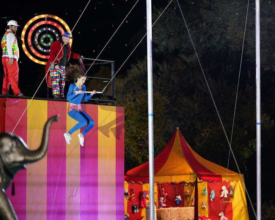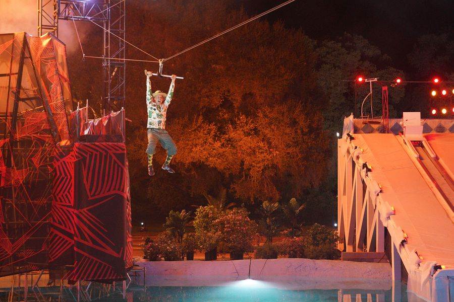 Nope. The exact same thing happened with Anthony locked and loaded onto zip line and he too landed softly and gently on the pool. At this point, Joe and Rob thinking something is amiss and demand that someone looks at the turbo-charging of the zip line.