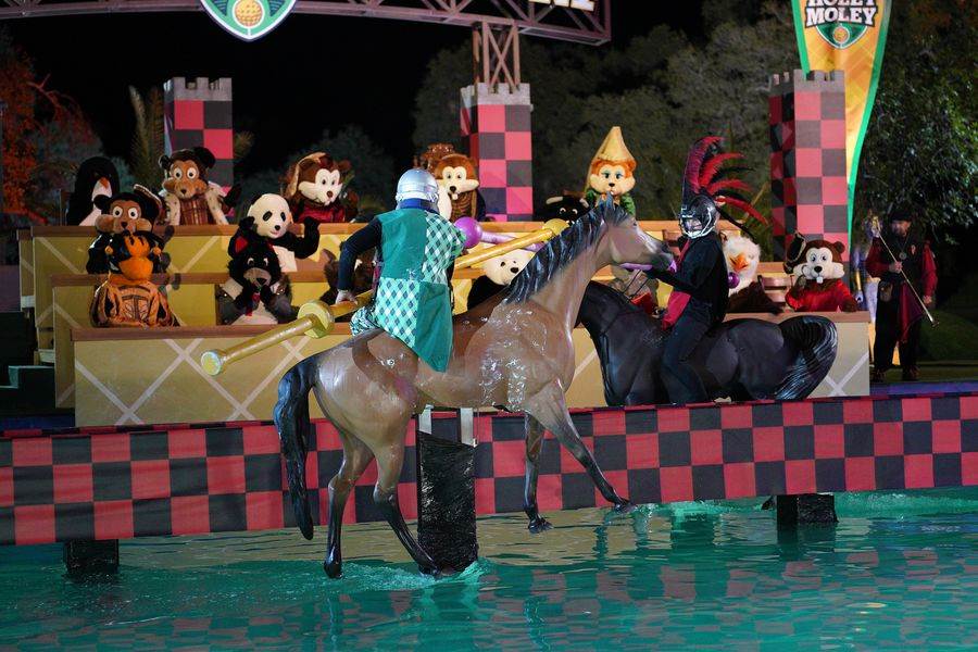 For the first time this season, we get to see a returning hole from last season, King Parthur’s Court. Tonight, we see Andrea v. JC, take on King Parthur. Andrea had a nice putt making it on to the green, which Rob didn’t think was going to happen. Fortunately, Joe and the producers have a complete register of every time that Rob has been wrong on the show. JC takes his turn and lands on the wrong side of the sword. He saddles up and gets knocked off the horse, but stops himself (and as such, the horse) by bracing his feet between the horse and the barrier before he hit the water.