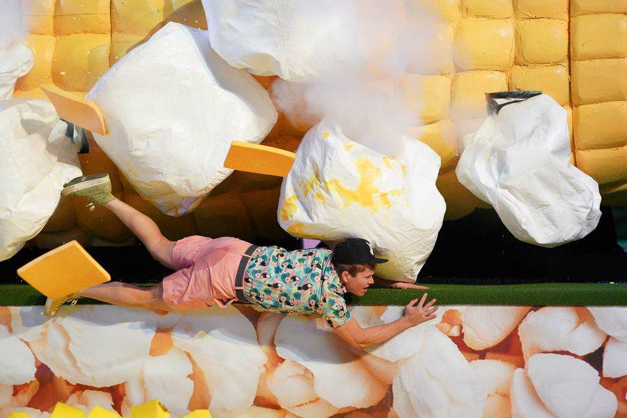 Dennis’ wobbly putt wasn’t nearly as successful, and he too got a slow start, getting stopped by the gorilla as he flung his door open. Dennis, who’s white clothes are no longer white, takes his putt from the drop zone and makes a bid situation worse by hitting one of the guard walls. Rick, however, landed his putt with ease and moves on to the next round.