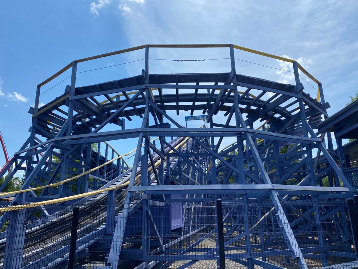 A classic that was recently updated with a brand-new color scheme is the Carolina Cyclone, known as the first ever coaster to go upside down 4 times. The new teal color scheme really pops and gives new life to this classic. Mind you, it certainly is a bit rough, but that’s expected given its age (opening in 1980). However if you can look past that, this is a fun and intense little coaster.