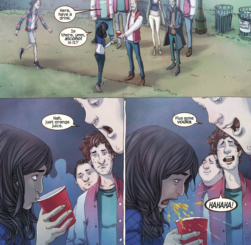 Kamala goes with Bruno to the party, where they meet Nakia and Miguel, who is hovering. A guy offers them a drink and Kamala asks if there is alcohol in it. He tells her it’s just orange juice and she takes a sip, immediately cringing from the taste before the boy reveals there’s vodka in it. This moment is lifted right from the comics.