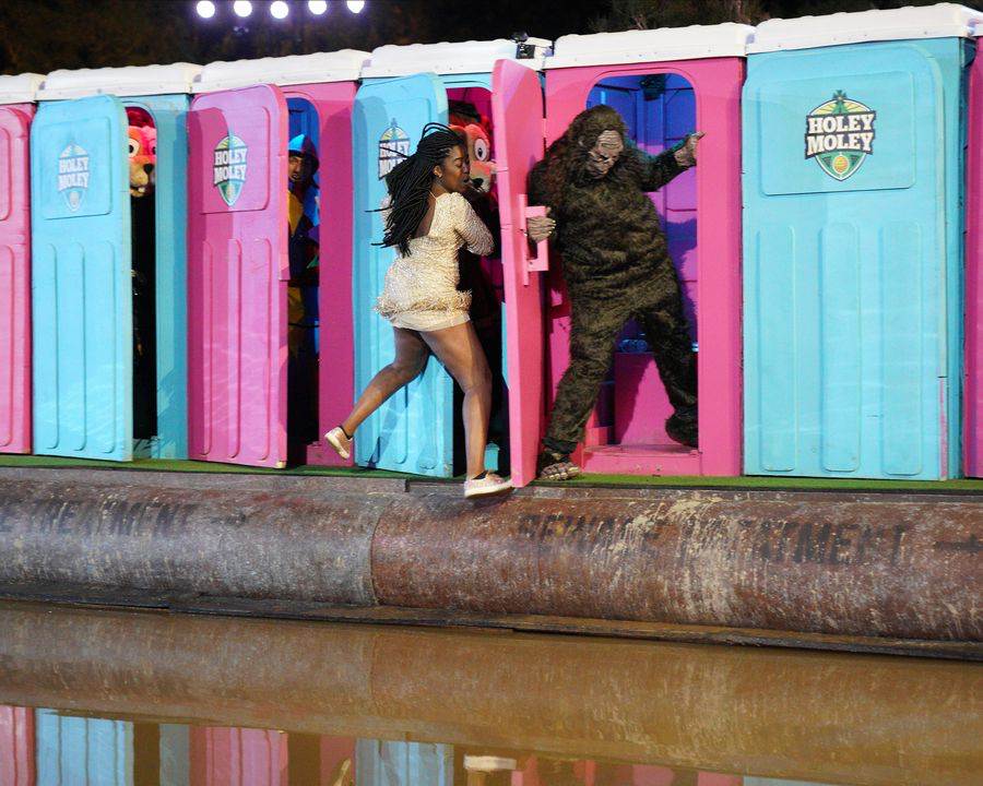 The second hole tonight, appropriately enough, is Hole Number Two where Allie and Kiara must putt alongside a row of outhouses each containing a character ready to emerge. Kiara putts directly into the mucky water and must putt from the drop zone. Her sprint past the outhouse doors didn’t fare much better, and she gets knocked wildly (complete with spin!) into the “substance" below. Allie’s putt makes it to the green but does hit a wall that takes it further from the hole. Her sprint is almost successful but one of the last outhouse doors clips her and sends her into the muck. After a brief commercial break, we wrap up with a summary of putts showcasing that Allie won the hole.