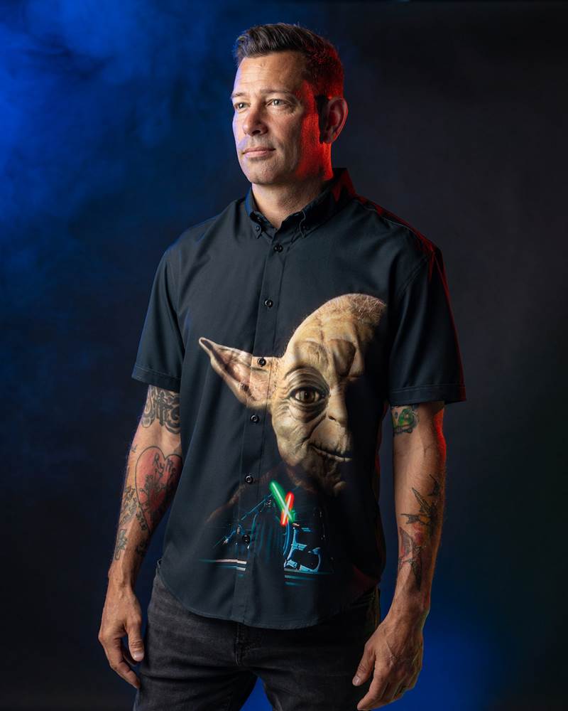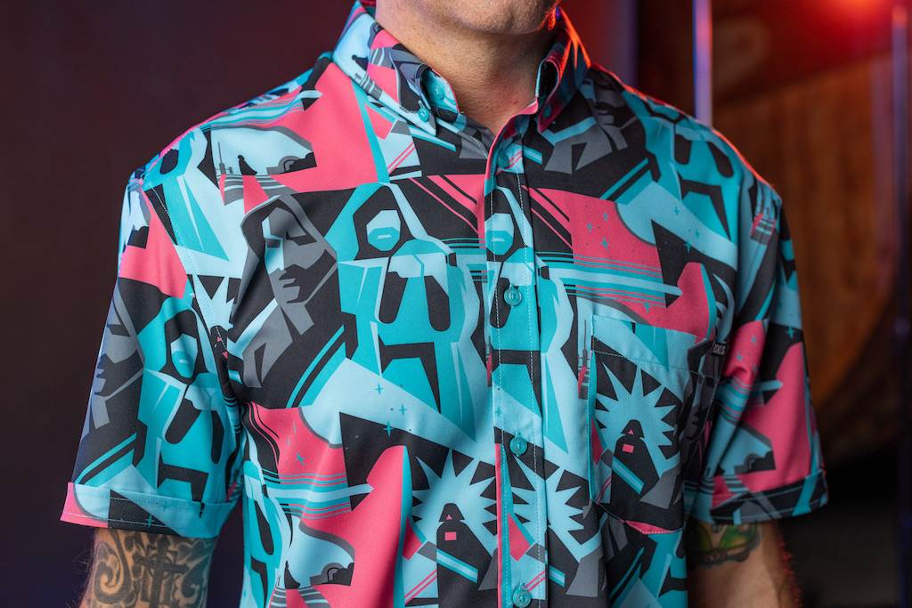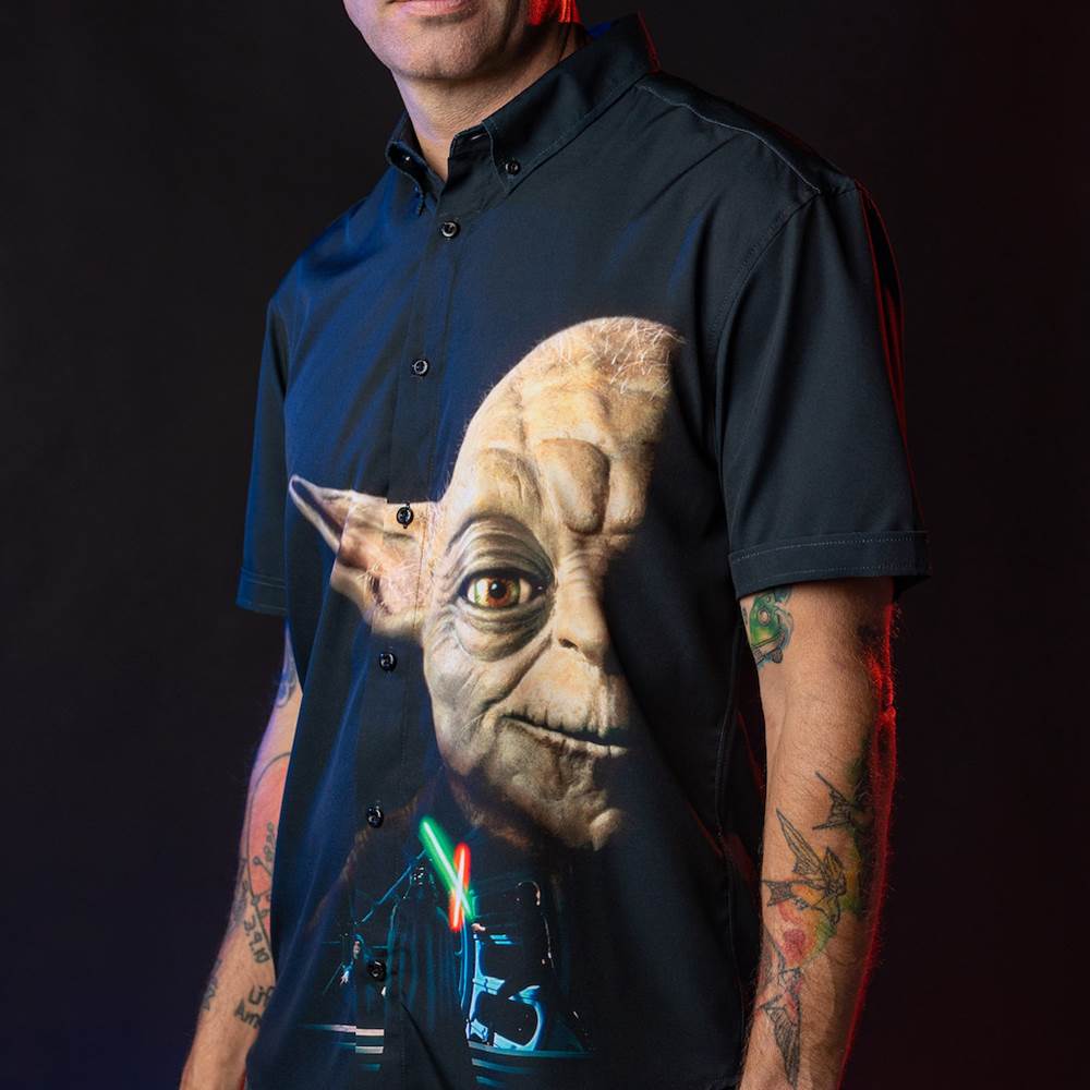 Cue the nostalgia! Star Wars fans of a certain age will immediately recognize this design as the VHS cover of Return of the Jedi. Here Yoda gives a sagely smile knowing that there’s hope for the Rebellion after all. Meanwhile Luke and Vader battle it out with lightsabers before the Emperor. Ahh! We love it! The print is available in traditional Kunuflex button downs.