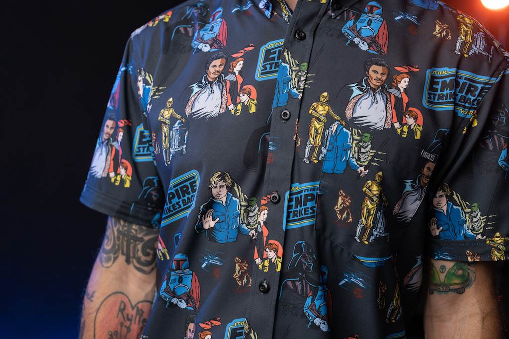 Moving on from Vader (kinda) comes this retro Empire Strikes Back design that gives great attention to Lando Clarissian, Luke Skywalker and Boba Fett. Don’t worry, mixed in amid the movie logo are images of Leia, Han, Chewbacca, R2-D2, C-3PO, Yoda…are we missing anyone? Available in traditional Kunuflex button downs and koozies.
