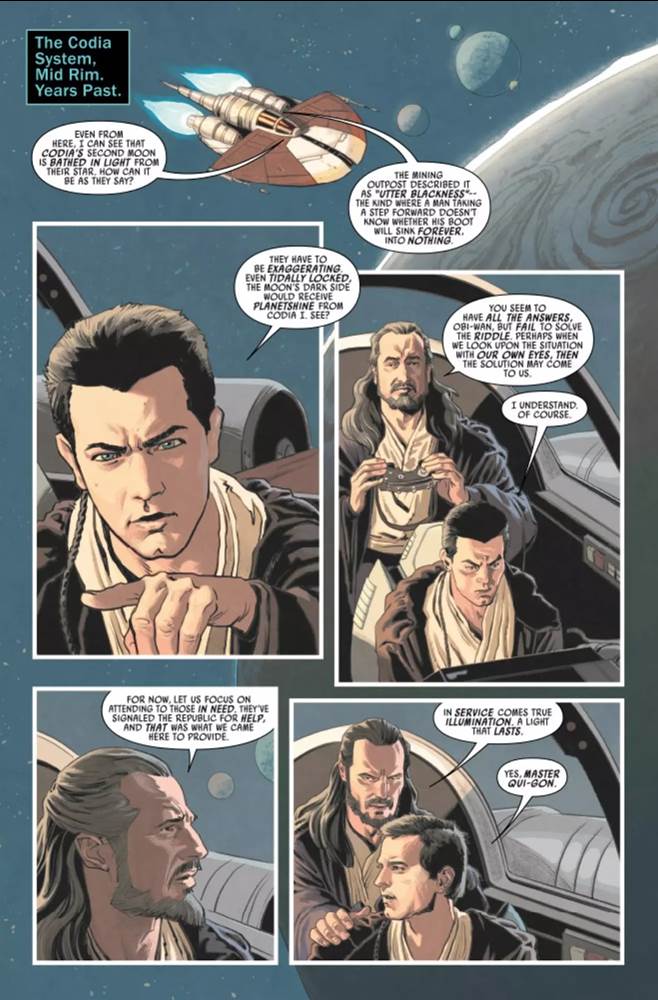 Obi-Wan continues to write in his journal, first thinking back on his recent encounter with Maul in the Tatooine desert (as first seen in the Star Wars Rebels animated series), then reminiscing about a perplexing mission with his old master Qui-Gon Jinn to the Codia System in the galaxy’s Mid Rim. Qui-Gon and young Obi-Wan arrive on Codia’s second moon to find that the celestial body has been bathed in darkness– even their trusty lightsabers seem to be dimmed upon activation. They investigate a mining outpost that had recently been invaded by thieves, the two Jedi unable to see much in front of their own faces without the use of modified macrobinoculars. Inside, they find the power core disabled and numerous blood-covered victims of what appears to be a wolf-like monster running loose in the facility. Upon meeting a Gran survivor from the mining crew, Obi-Wan and Qui-Gon discern that the “monster" is in fact a member of the Defel species (originally spotted as one of the wolfman costumes from the Mos Eisley Cantina in the original Star Wars film) who has been driven mad by the changes in radiation caused by the damaged power core.