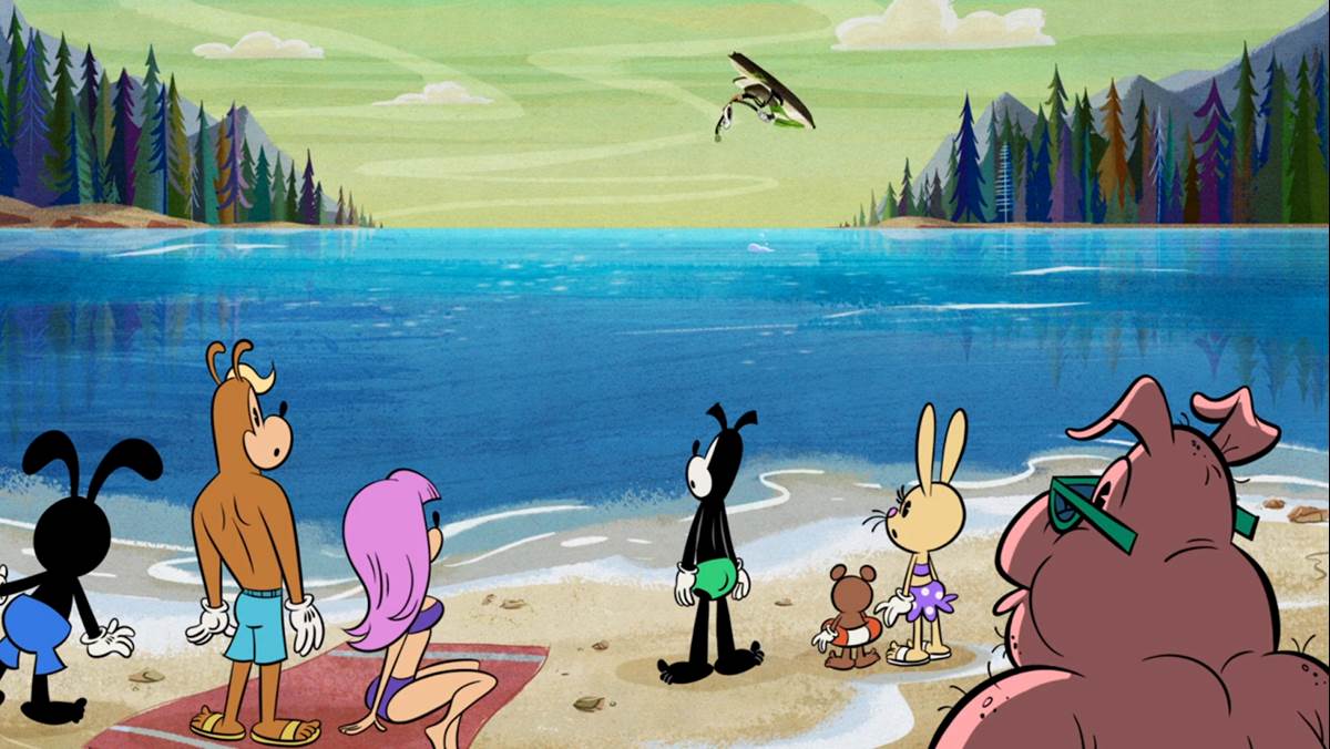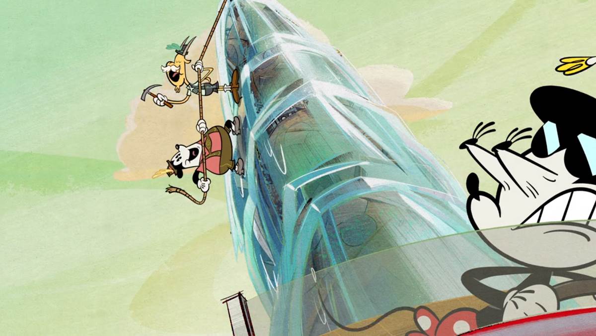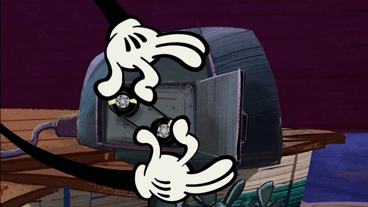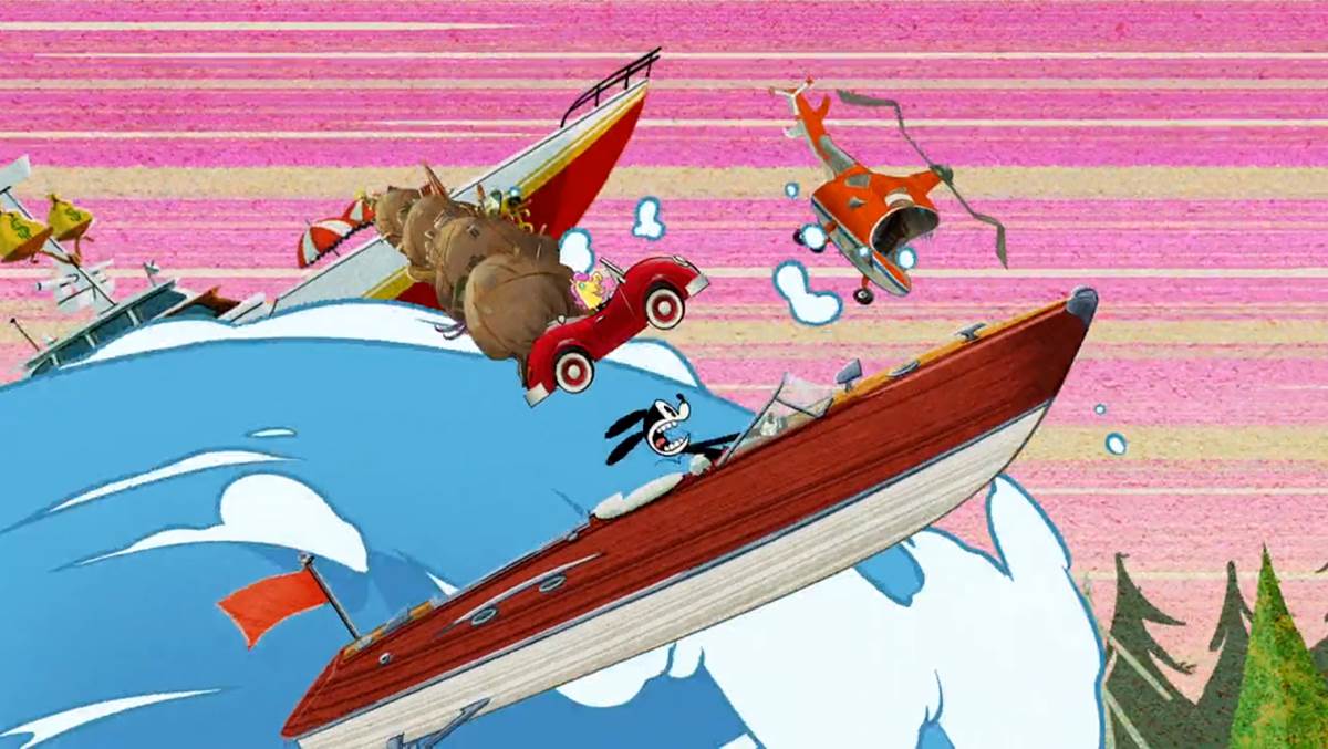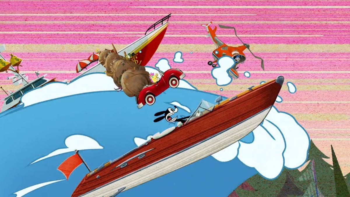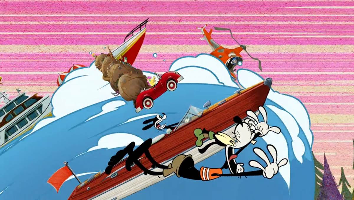 At the kiosk, Goofy rents ten wet skis (“One for each foot!") and the segment suddenly becomes a narrated “How To" short about wet skiing (or shee-ing, a nod to The Art of Skiing). Wrangling and riding all ten wet skis at once, things go horribly wrong and they all get sent in the opposite direction of the water traffic. In a crowd of onlookers, we see Oswald the Lucky Rabbit watching the unlucky accident.