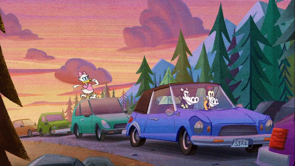 Minnie overloads her car, stuffing everything under a soft top that breaks shortly after she starts driving. She goes slow, trying not to spill anything, but angry drivers behind her put on some pressure as she causes a traffic jam. Worse, the heat of the sun is melting the ice cream! She turns the air conditioner on high to freeze her tower of stuff, suddenly finding some alpine climbers on board. She drives under a tree branch to flick them off, shouting “See ya lederhosen," but the distraction caused her to crash through a guardrail and onto train tracks.