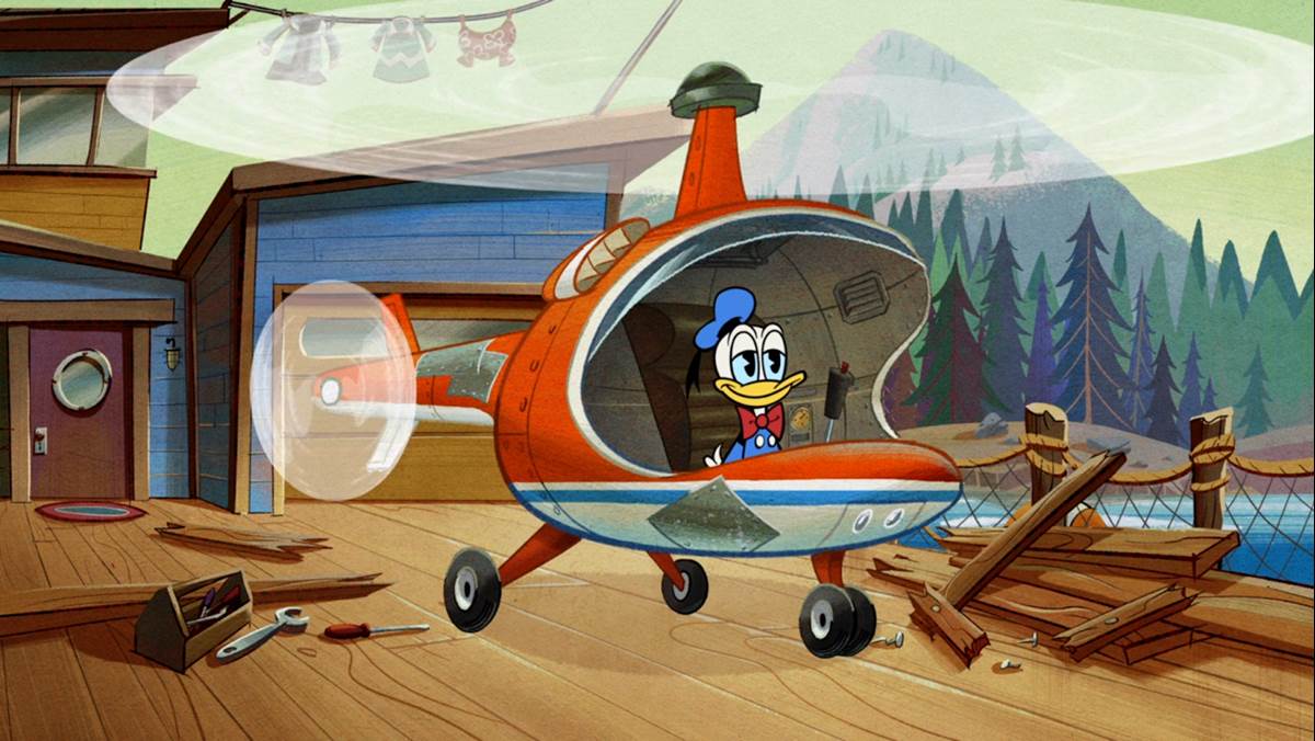 Flying alone to the marina, a big pile of stuff gets in his way (from Minnie’s car) and a bottle of soda gets stuck to his wheels, making contact with mintos. The eruption sends the helicopter flying up to Earth’s atmosphere and then it falls back down. Donald tries to regain control but crashes into a forest near the marina, chopping trees, and sending logs flying into the water. Regaining control, he gets back on course towards the barge when a ton of food suddenly hits the blades, a piece of bread obstructing Donald’s view, sending him into the marina just as a luxury yacht creates a wave that sends the chopper into the barge.