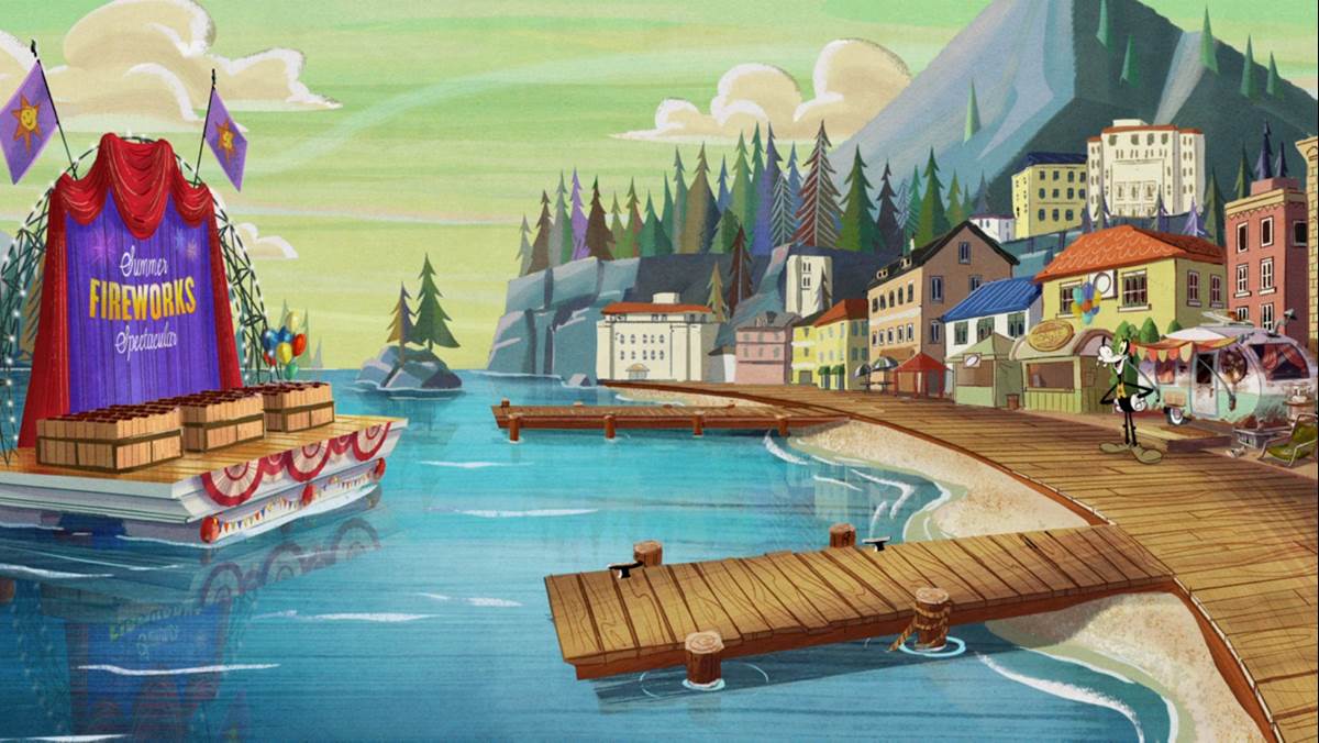 Goofy’s recollection of the 2:00 am call is everyone speaking gibberish. Panning back, we see that he was in his camper on the marina right by the barge. “Gawrsh, I hope Mickey finds that perfect spot," he hayucks. His responsibility is to look for summer fun to entertain the gang before the show. The boardwalk is bombarded with options, including tandem bikes, beach balls, and jetskis, the latter of which blows his mind.
