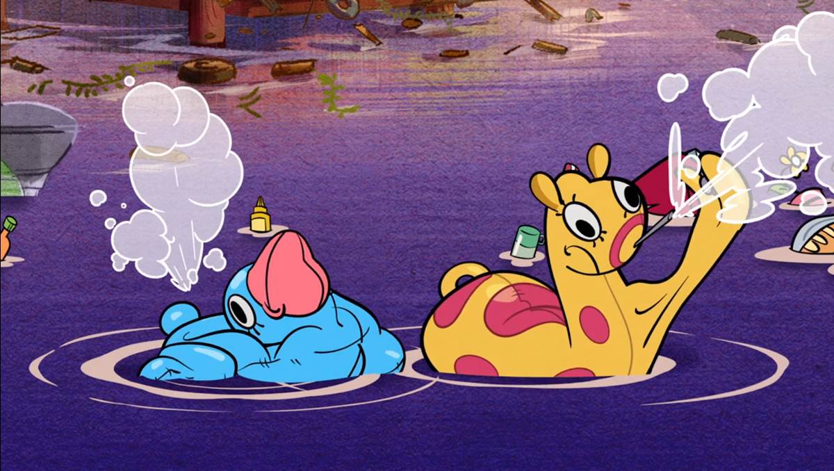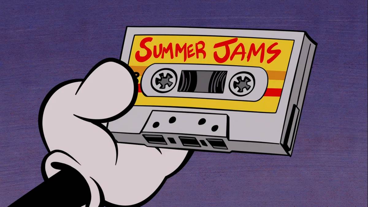 Mickey is determined to make things right. When he steps on some of Minnie’s condiments, ketchup and mustard squirt into the air and he gets an idea, pulling his pals into a huddle and whispering a plan. They scoop all the debris out of the lake, attach soda bottles to wet skis, and fix the helicopter. Mickey takes the mic and introduces a new Summer Spectacular, but when they push the button nothing happens. Mickey inspects the display and realizes a tape in a machine broke, breaking apart his Summer Jams cassette and replacing the spool.