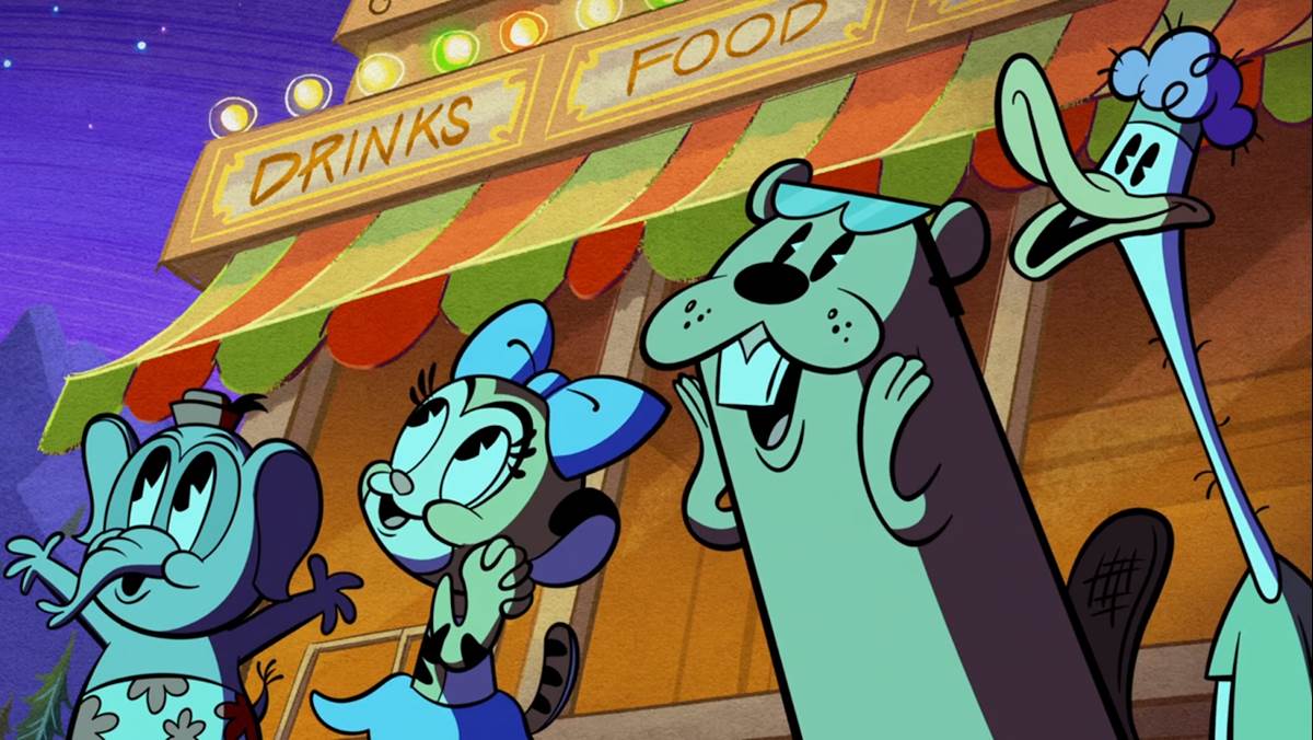 Minnie knocks her food into the helicopter blades, distributing snacks to onlookers around the marina. A fireworks show made entirely of exploding sodas and condiments begins. Among the onlookers are Elmer Elephant and Tilly Tiger from the classic Silly Symphony short.