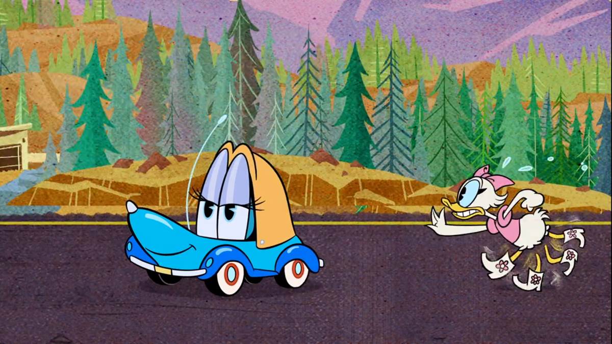 Frustrated, Daisy gets out of the taxi and proceeds on foot, running over cars. A convertible driven by Clarabelle Cow and Horace Horsecollar opens its top at the wrong moment, springing Daisy backward… all the way to her house! A luxury yacht sails by and Scrooge McDuck waves to Daisy, who asks for a ride.