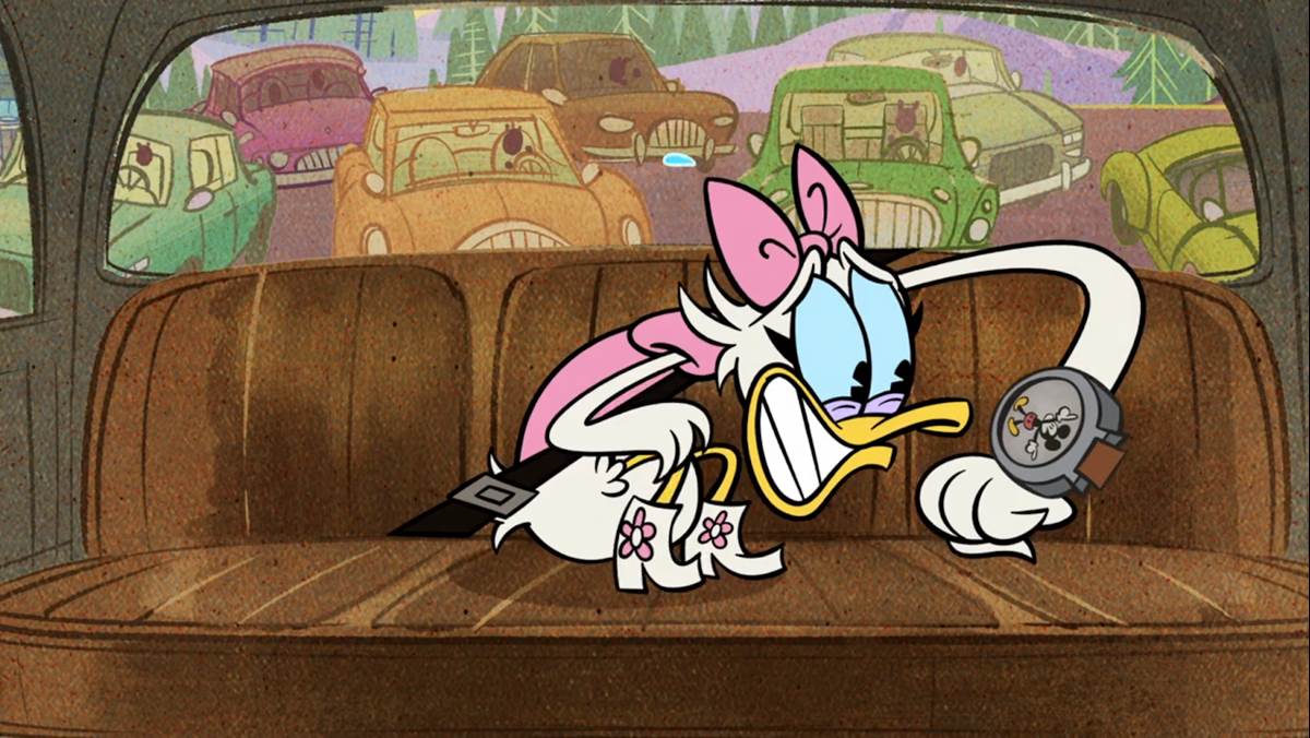 She goes back to the taxi driver on his tea break and scares him into wrapping it up. Now on her way, she is next stopped by bad traffic (caused by Minnie) and as Daisy checks the time on her Mickey Mouse watch, she imagines Mickey taunting her to not be late.
