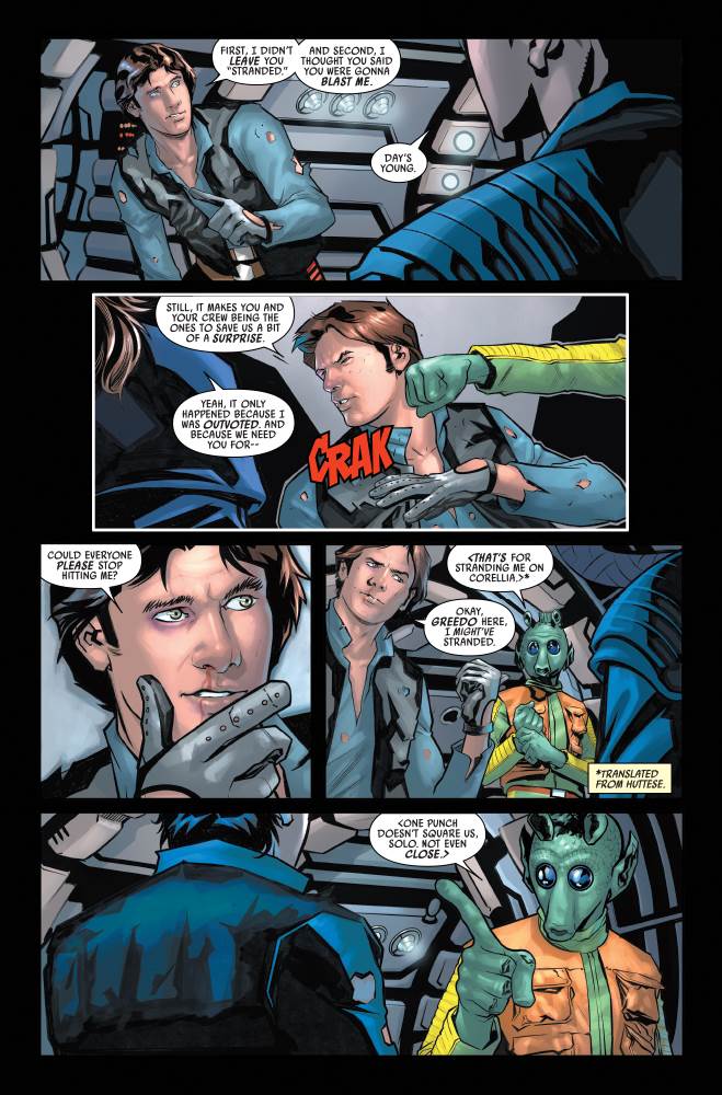 Han Solo & Chewbacca #5 begins where the previous issue left off: with Han and Chewie stranded on the Mollo Tanka Planetoid after Tyra (still posing as Han’s dad Ovan) took off with the Millennium Falcon. Cornered by bounty hunter Black Krrsantan, the title duo find their only means of escape via a rival gang of mercenaries (first seen in issue #1) flying a similar-looking Corellian freighter. Also aboard the ship is Greedo, who Han previously left stranded on Corellia. This crew has also been hired by Jabba the Hutt to retrieve the urn containing the remains of his arch-rival, and our heroes are surprised to find they weren’t the only ones assigned to that particular task. Meanwhile, Marshal Buck Vancto tracks Corbus to Iakar and takes him into custody back to Paqualis III, where the Marshal Service is headquartered. One jailbreak later (thanks to the tracker Han had placed on his “father," since he didn’t really trust him all that much to begin with) and Vancto finds his quarry reclaimed by the mercs. There’s one minor snag to the outcome of this operation, however– in the scramble to escape, Chewbacca gets captured by the Marshals and taken to prison.