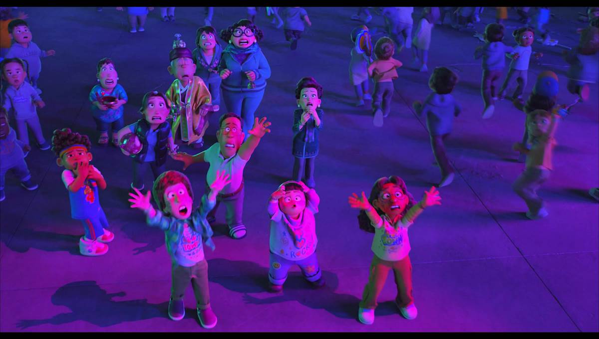 Crowd characters can also be animated ahead of time with various sets of movement and added to a library that artists can select from when they are animating their scene. Reportedly, the original crowd animation of the Giant Ming Panda that arrived at that concert showed the crowd too terrified to the point where the actual audience became too scared for that particular moment in the film. So, the artists went back to their preselects, and found some lower intensity panic motions that were pulled from crowd animation in both Onward and Incredibles 2. The note came so late in the game, that with the help of the new system, the scene took only about a day's worth of work to change.