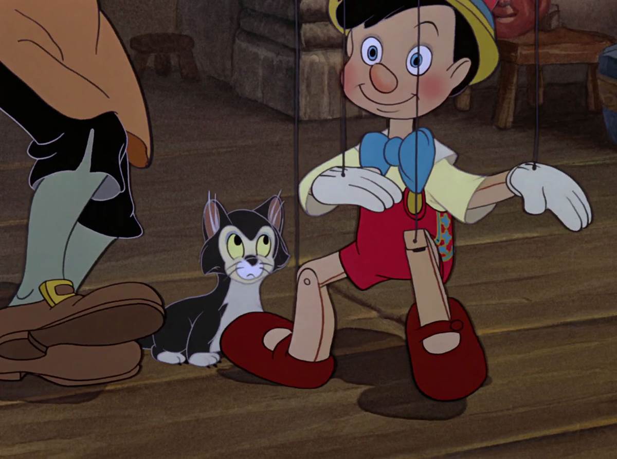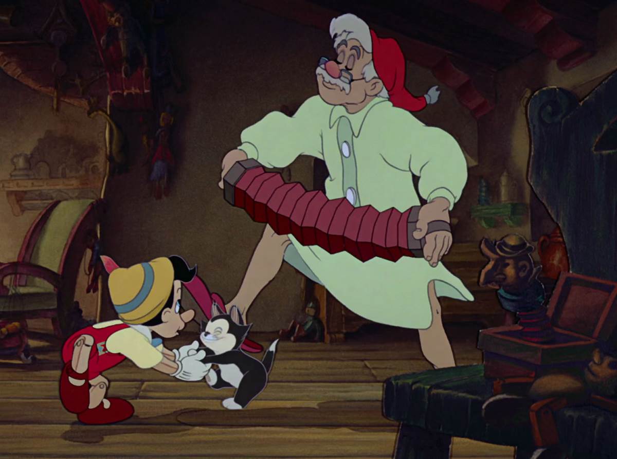 Early in the film, before the visit from the Blue Fairy, Geppetto dances around with his newly finished marionette, much to Figaro’s chagrin.