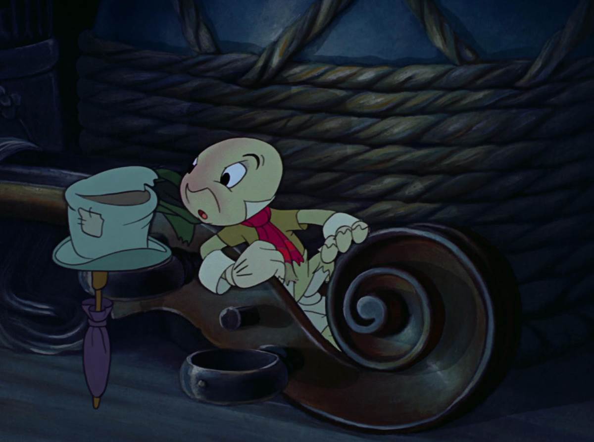 Of course, when the Blue Fairy does arrive, her presence awakens Jiminy who is resting peacefully nearby.