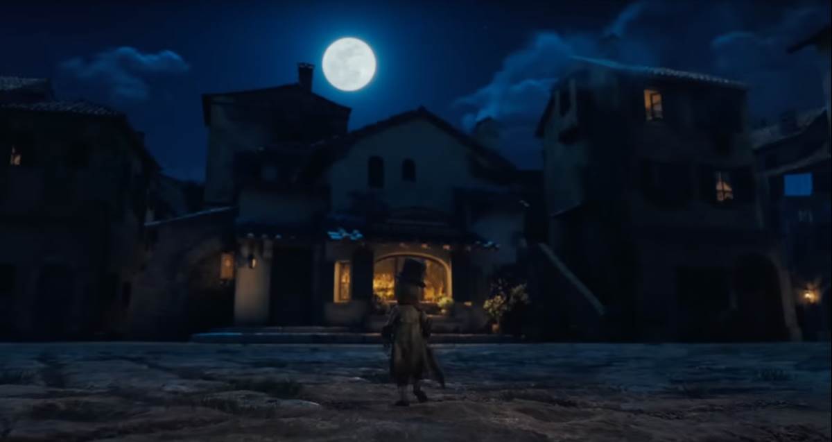 Immediately, we see Jiminy (voiced in this version by Joseph Gordon-Levitt) outside Geppetto’s workshop and home on approach. In the original film, we are treated to more of a POV shot as the iconic cricket bounces along looking for warmth in the evening.