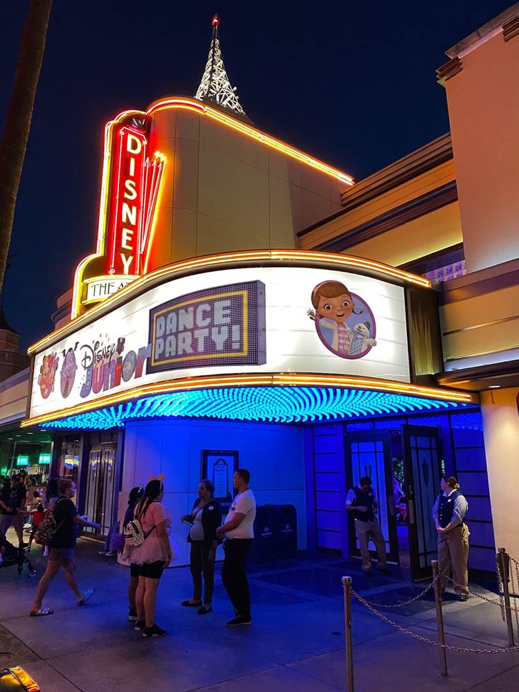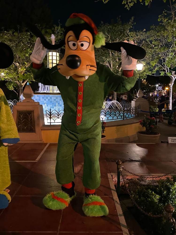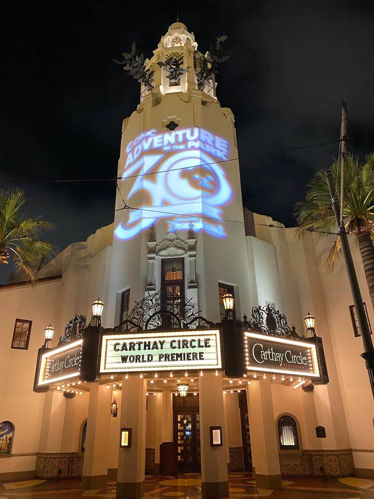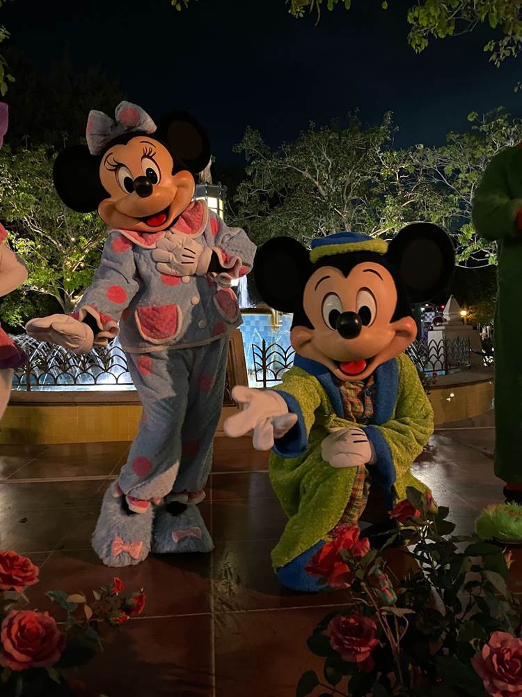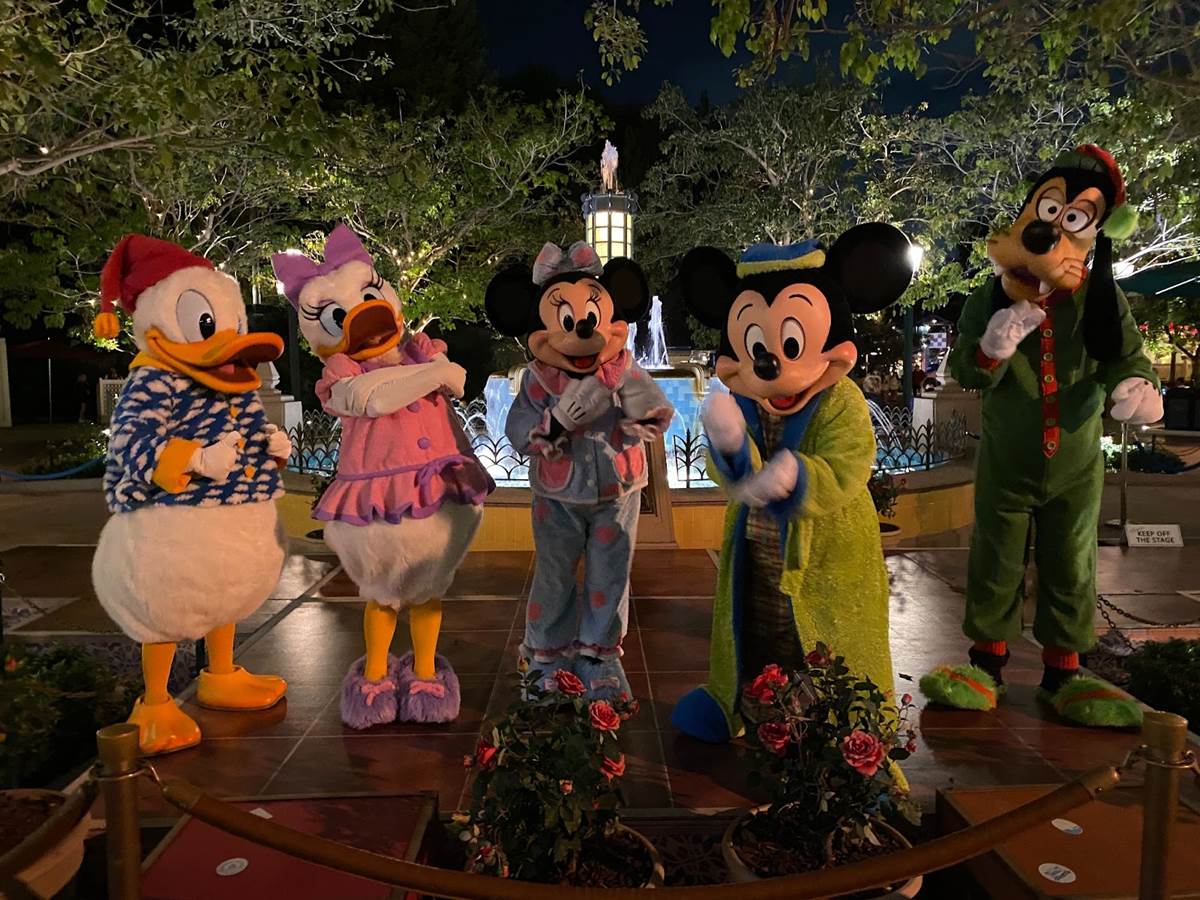 As a surprise on the way out of the park that night, Mickey and Friends were decked out in their pajamas to wave goodbye to the crowd in front of the Carthay Circle fountain on Buena Vista Street.