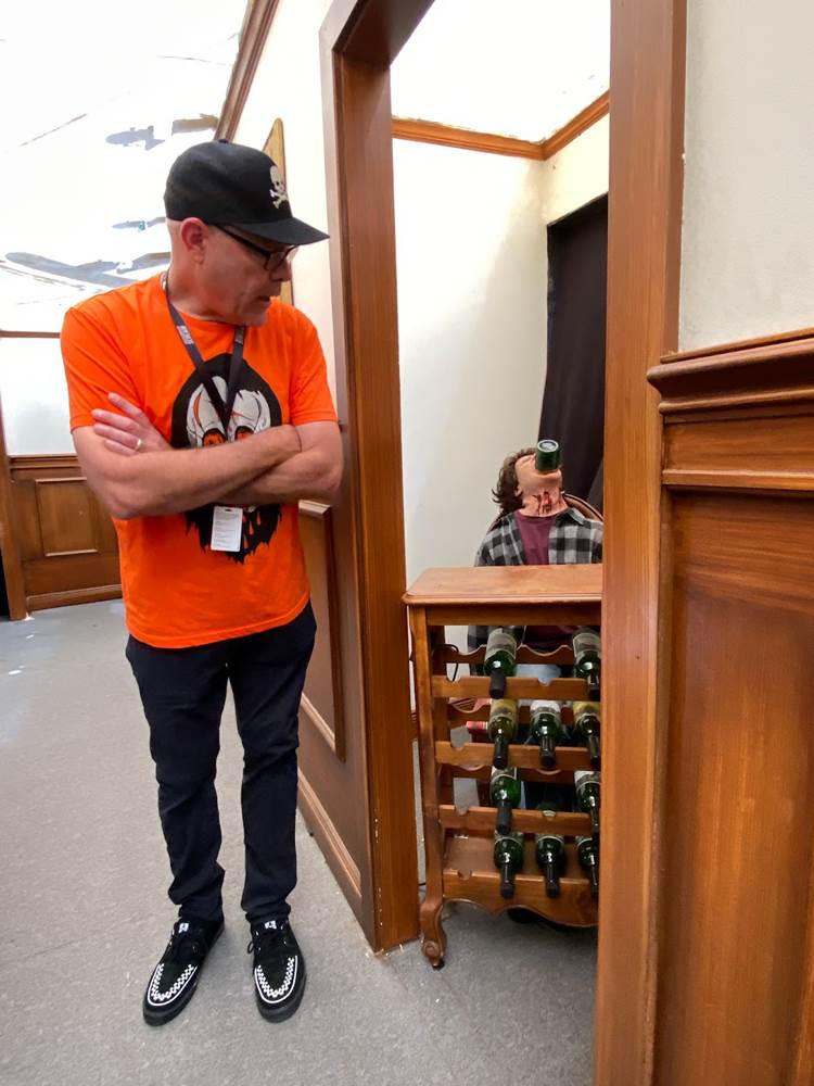“This is our third Blumhouse compilation house that we’ve done at Horror Nights, although we started working with Blumhouse back in 2013 the first time we did Insidious," began Murdy as he began our walking tour of this year’s “The Horrors of Blumhouse" haunted attraction. “We’ve had a long relationship working with Jason Blum and his company. A couple things that are different this time around: the previous two ‘Horrors of Blumhouse’ experiences that we created, we always set it in a movie theater– it was always a ‘Horrors of Blumhouse’ film festival. The reason we changed it this year is the location. It used to be in the Parisian Courtyard, and then once it was downstairs on the Backlot. But this year, as we were shuffling the slate around and figuring where we were going to put things, we decided to put it here in the Waterworld location. It has this big permanent shade structure, so we couldn’t build the facade that we’d built before, but that gave us an opportunity to create something new. So literally as a joke, my art director says, ‘The movie theater’s not going to fit. Why don’t we do a video store?’ And I was like, ‘That’s brilliant,’ for a couple of reasons. One: I worked in classic mom-and-pop video stores from the time I was in high school all through college. Even when I started at Universal, I still worked there on the weekends."