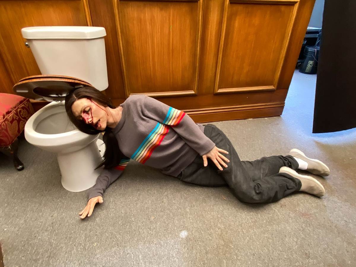 And then we get to the wood shop. We wanted to create an effect where Millie could take the body, push it through the saw blade, and have it split and splay open. This is all just a mechanical, practical effect. We do a lot of practical effects, because that’s just the nature of what we do, but we’re trying to take it to the next level. This of course has a massive compressed-air and water spritz, and then she has a screwdriver that she can pick up."