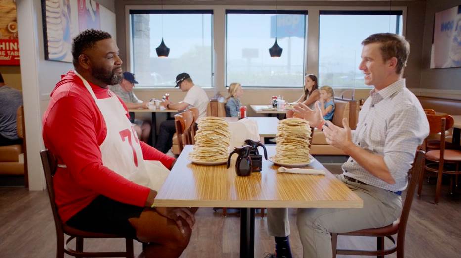 Eli’s first stop is an IHOP in Ohio, where he meets with Ohio State legend Orlando Pace to talk about the pancake block. I know, it’s a bit on the nose. For those who are unfamiliar, a pancake block is when an offensive lineman puts a defensive player on his back. The two sit down to talk about pancake blocks while eating a stack of actual pancakes. Pace talks about how his Heisman Trophy campaign is what made the pancake an official stat for offensive linemen. In his senior year, he collected 80 of them.
