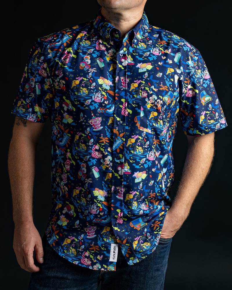 RSVLTS D23 Expo booth exclusives feature three designs that span different franchises but are united in one theme: food and beverage! For the Marvel comic lover there’s a Deadpool inspired chimichanga style; a truly mad and wonderfully colorful Alice in Wonderland top classic Disney fans will enjoy; and a The Mandalorian shirt featuring Grogu with the best snack of all—FROGS!