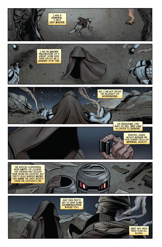 Obi-Wan #5 begins with the sandstorm having passed Old Ben’s hut in Tatooine’s Jundland Wastes, and a smash cut to an Imperial garrison in Mos Eisley, where Tusken Raiders have made off with several ration containers during the storm (I wasn’t under the impression that the Empire had any kind of presence on Tatooine prior to the events of A New Hope, but that doesn’t mean it wasn’t possible). An Imperial officer commands a squad of stormtroopers to go out into the desert, retrieve their rations, and eliminate the Tuskens who stole them. Meanwhile, Ben seeks to replenish his supplies by riding his Eopie to a nearby Jawa sandcrawler. We are meant to think (and the deceptive cover of this issue would imply) that these two parties are on a collision course that will lead to hostilities, but there’s more than a little misdirection happening here. Instead, the stormtroopers attack the Tusken camp and find that it’s populated only by decoys. Then the troopers themselves are massacred, with the “Sand People" taking their blaster rifles in addition to holding onto the Imperial rations– it seems this was their plan all along. The remainder of this issue is about Obi-Wan stumbling across a surviving stormtrooper while scavenging the dead ones for power cells. He takes the survivor (unwillingly) back to his hut and nurses him back to health, while in captions we read additional notes in Ben’s diary meditating on the Jedi way as instructed by Qui-Gon Jinn.