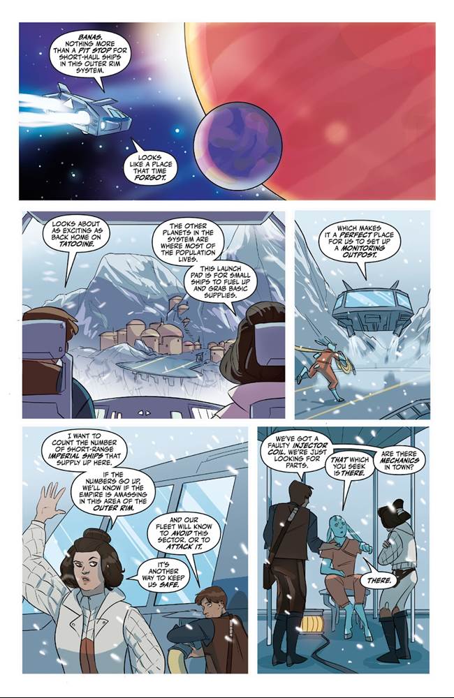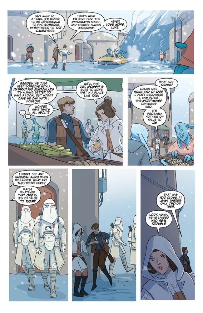 The secret siblings explore the main settlement on Banas while attempting to evade the Empire’s snowtroopers, ducking into a Lost & Found shop where the persnickety proprietor eventually helps them escape, though he refuses to take sides in the Galactic Civil War. Luke and Leia then must flee the town through the surrounding mountains, where they discover the real reason for the Empire’s interest in the planet, ultimately using the local environment and their own wits to defeat the enemy and return to the fleet. This issue was written by Cecil Castellucci (Star Wars: Moving Target - A Princess Leia Adventure) and as a story it works fine, but the dialogue between characters often feels extremely clunky and overly expository. The art by Megan Huang (Star Wars: Ghosts of Vader’s Castle) is cartoonish and loose, with the likenesses frequently looking off-model, but I think it’s appropriate enough for a comic like this one that is ostensibly aimed at younger readers.