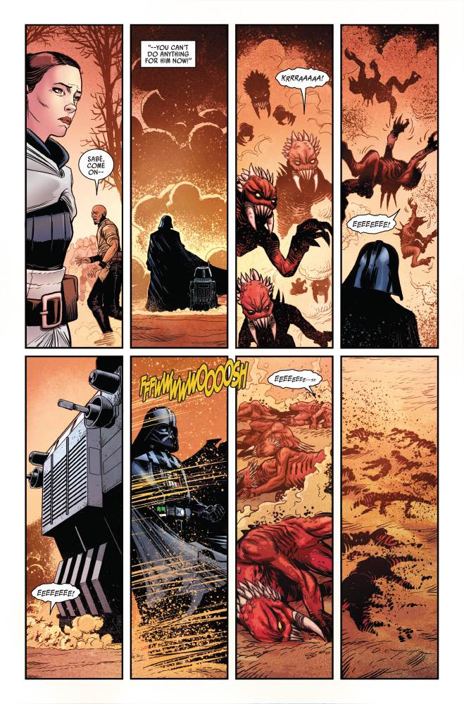 Ostensibly Vader is there to kill Tauntaza, but the fact that he can (and almost seems willing to) help Wald and Kitster’s fledgling society along the way points to a potential for Anakin to still do some good, even in this dark form. There’s just one problem, however: this Death Machine appears almost impenetrable, with Admiral Piett firing down upon it from Vader’s orbiting star destroyer with no apparent effect whatsoever. It’s lucky for Vader and company, then, that they have a couple of handy droid companions along for the ride. The astromech known as M-7B (using ZED-6-7 as translator) slices into a databank and retrieves the behemoth’s schematics, thereby revealing a weakness on its underside. Then the poor astro droid is enlisted as a literal slicer, with Vader leading him out into the sandstorm, concealing his lightsaber in his torso, and sending him under the machine to do some damage. It’s a clever plan, but I couldn’t help but wonder why Vader couldn’t just throw his lightsaber under there using the Force– I guess it’s implied that organic beings are weakened even from standing near the deadly machine.