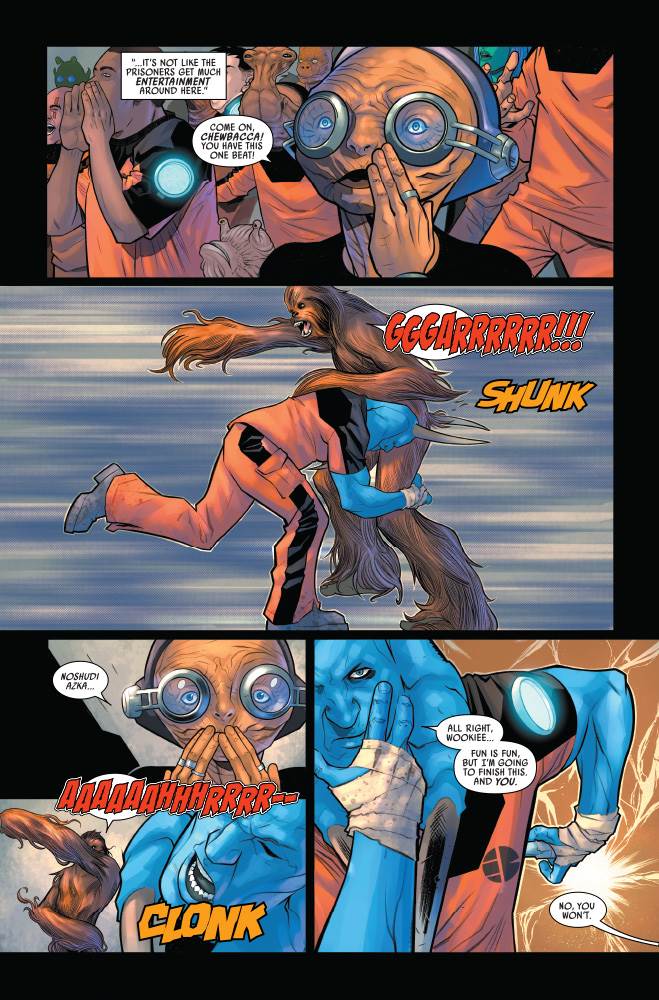 Case in point: Star Wars: Han Solo & Chewbacca #6 from Marvel Comics, which sees our favorite Wookiee sidekick Chewbacca imprisoned in a high-security facility on the planet Gulhadar controlled by the Benelex Marshal Service.