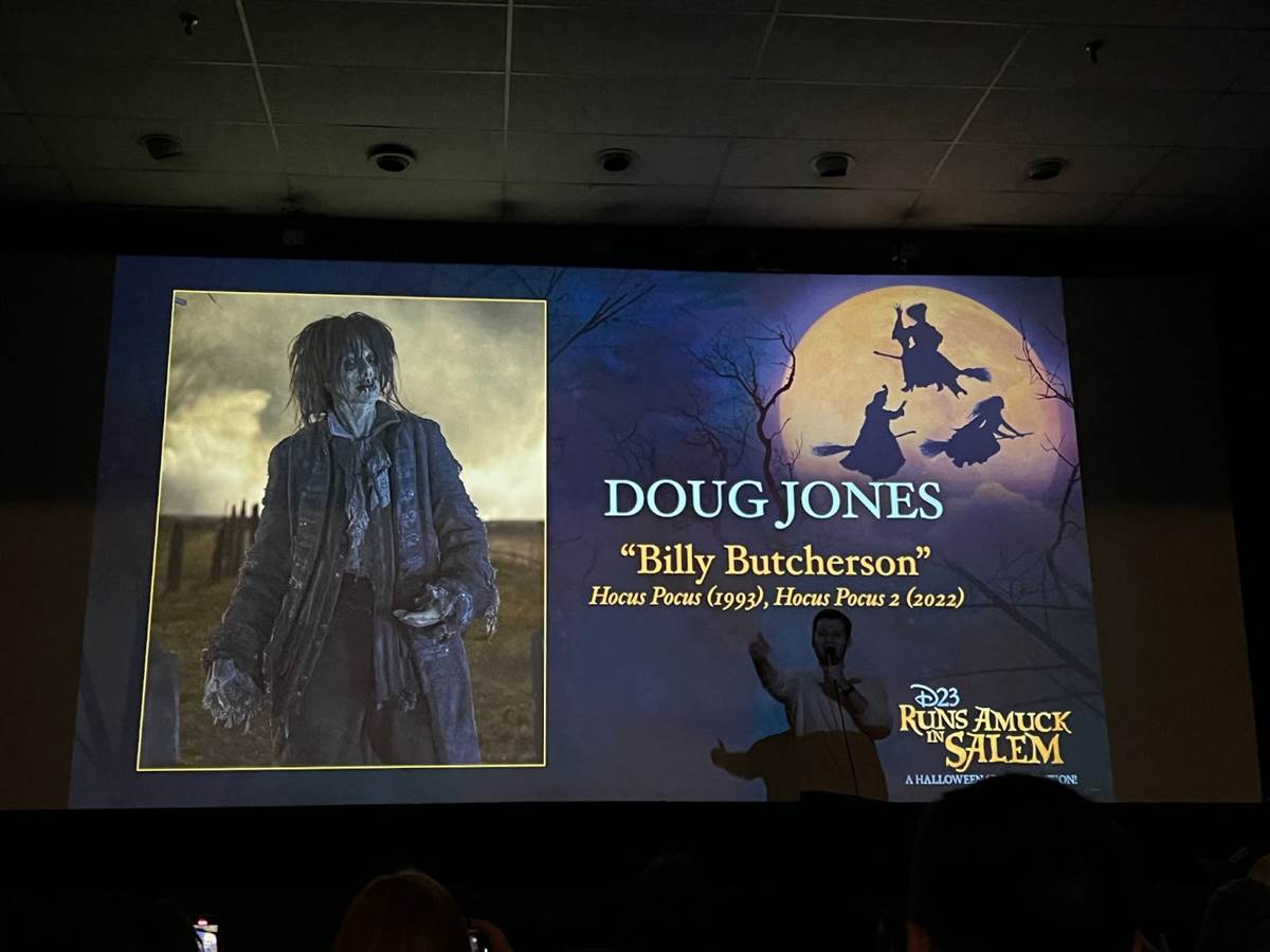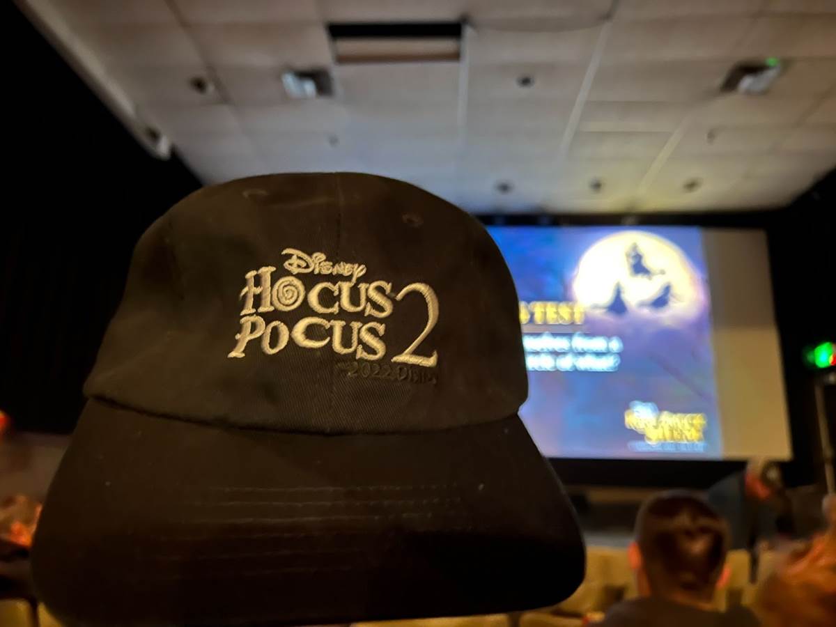 As we entered the theater, we were given a bonus goodie, a Hocus Pocus 2 baseball hat. And while we waited for the show, D23 kept us entertained with a reel of Hocus Pocus trivia.
