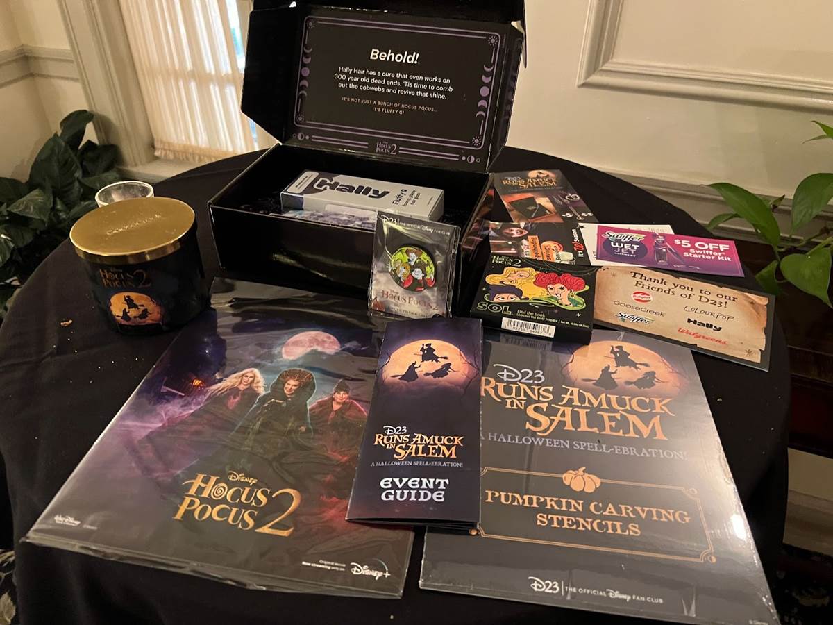 A D23-exclusive pin was promised with the price of admission ($250 per person), but the goodie bag also included a Hocus Pocus 2 candle from Goose Creek, Hally Hair’s themed Bewitching Shine Fluffy G + Comb Set, a Colour Pop sol shimmering highlighter, a D23 exclusive pumpkin carving stencil set, mini poster, and coupons for sponsors of Hocus Pocus 2, including Walgreens and Swiffer.