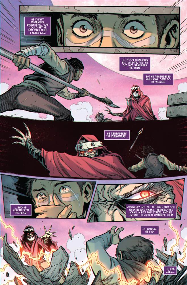 The High Republic’s second phase is set 150 years before its first, and that means writer Cavan Scott has again been tasked with introducing another entirely new cast of characters for this comic. The great news is that Scott– as always– does a terrific job of this, starting us off with flashbacks to Jedi Vildar Mac’s youth and a showdown with a member of the dark-side sect known as the Sorcerers of Tund. We then flash to the “present" of this title, where Vildar is still haunted by the PTSD of that incident. Mac arrives on Jedha, where he meets a young Padawan named Matthea Cathley (she goes by Matty) who shows him around the city. Here we get a taste of the conflict between the various religious faiths on the Pilgrim Moon, and it’s instantly rewarding to get so much information about the many ways people interpret the Force in this period of the galaxy. Some of this information has been out there already, of course, but I love seeing it spelled out in this way and getting to spend time with members of each denomination. There’s an altercation in the streets after a so-called “Truthsayer of Bpfassh" is called out for being a supposed charlatan during his stage show, which culminates in Vildar chasing an opportunistic pickpocket off down the city’s winding alleyways.