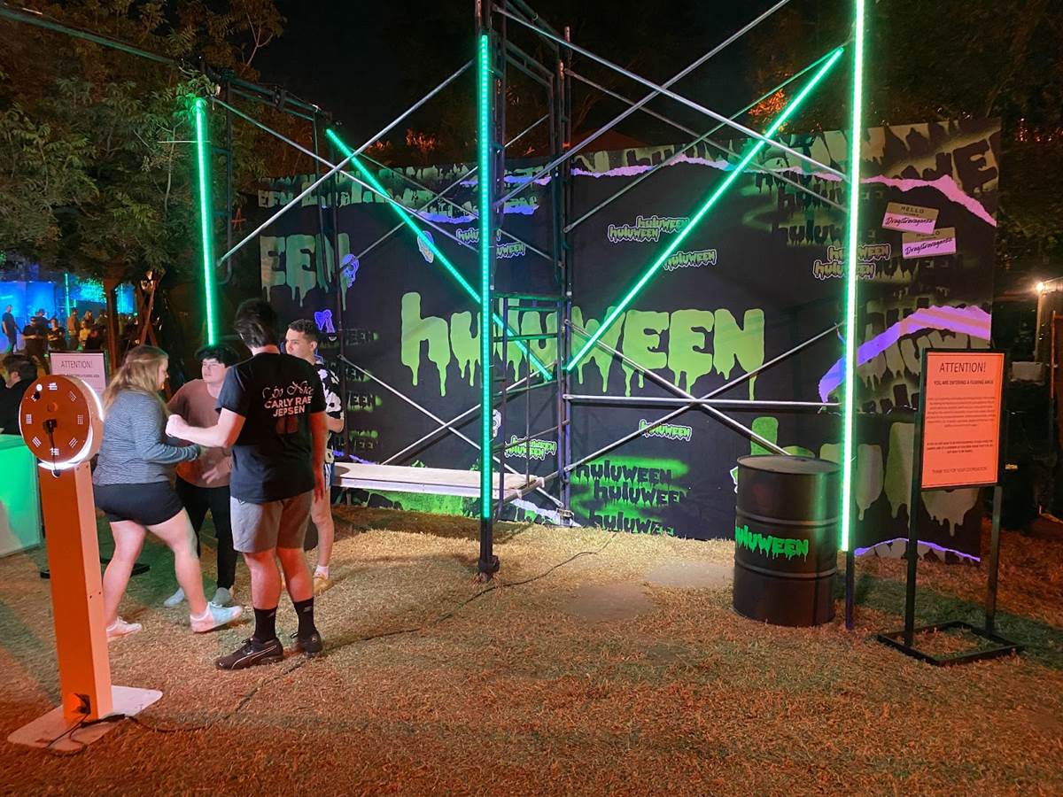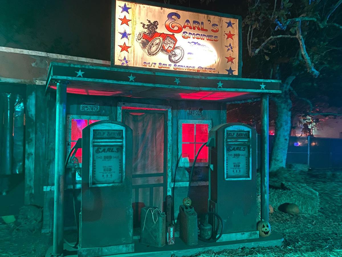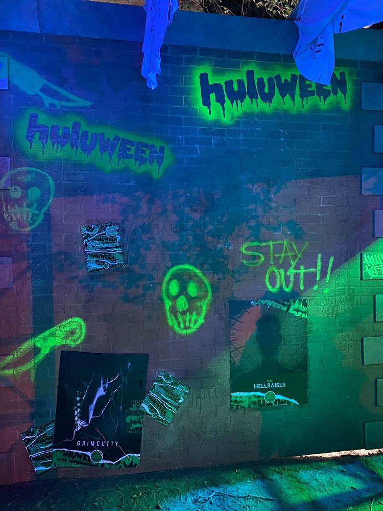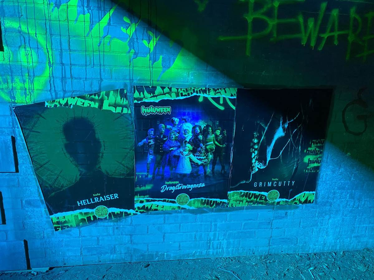 When it’s time to move on to the main event, guests will enter through a Huluween waystation decorated with posters for Hulu’s original Halloween programming like Hellraiser, Grimcutty, and Huluween Dragstravaganza. Then the entrance to the Haunted Hayride itself is made to look like an eerie abandoned gas station.