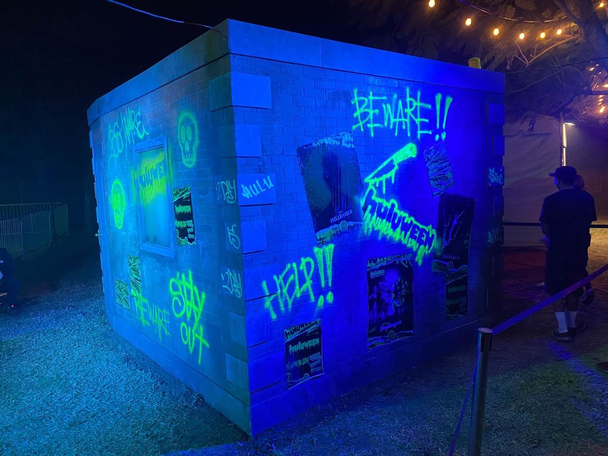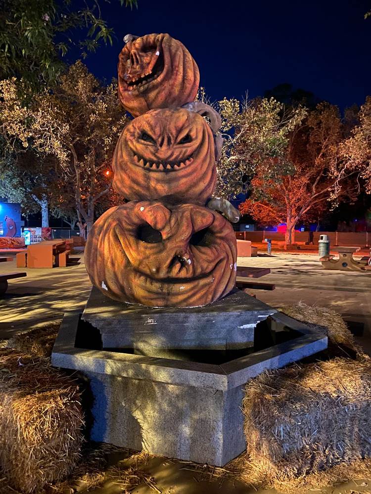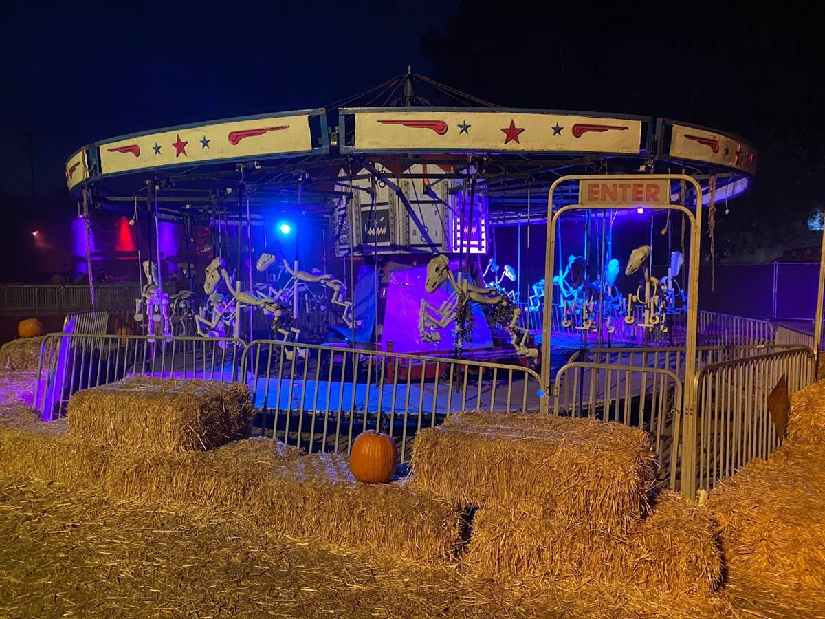 Next to the Haunted Hayride is another area decorated with a very cool tower of jack o’lanterns (perfect for photos) and another sponsored Huluween experience, this one a video opportunity housed within a tiny shack. There’s also a ghostly merry-go-round populated by creepy skeleton horses, though sadly it’s not actually rideable.